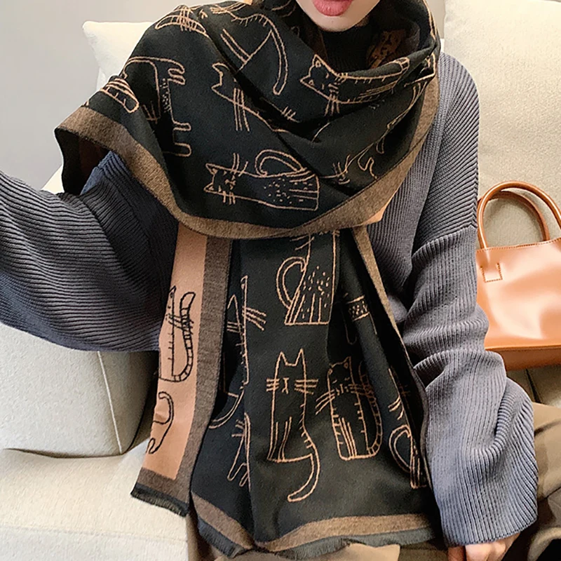 Кашемировый шарф с принтом, женский прекрасный кошачья шаль, плотный хиджаб, одеяло, женский шейный платок из пашмины, Bufanda, 2021