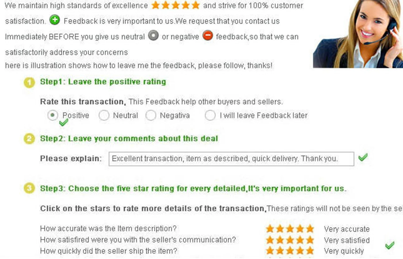 В случае, если вы удовлетворены нашим товаром, пожалуйста, потратьте минуту своего времени, чтобы оставить положительный отзыв и поставьте нам 5 звезд.Ваш отзыв очень важен для нас. Пожалуйста, свяжитесь с нами немедленно, прежде чем дать нам нейтральный или отрицательный отзыв, чтобы мы могли решить любые проблемы.