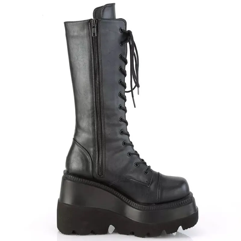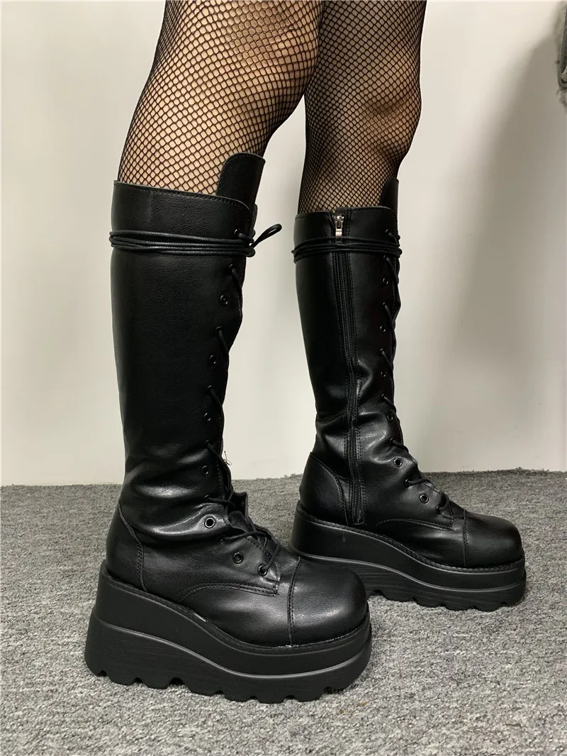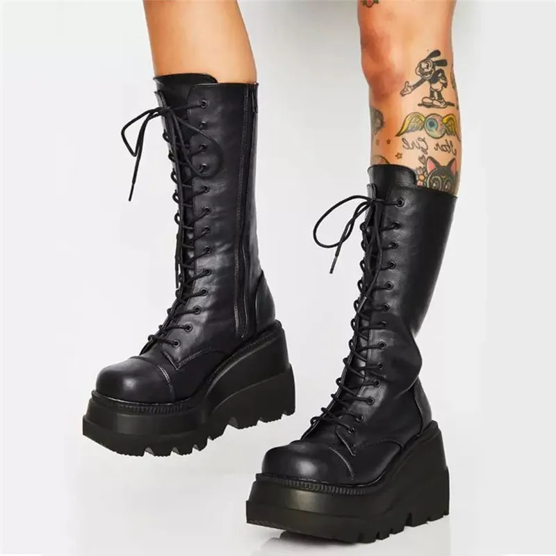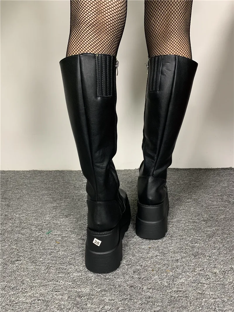 Женские сапоги до середины икры 2022, модные женские сапоги на танкетке, однотонные Сапоги на молнии с круглым носком, сапоги на платформе и очень высоком каблуке