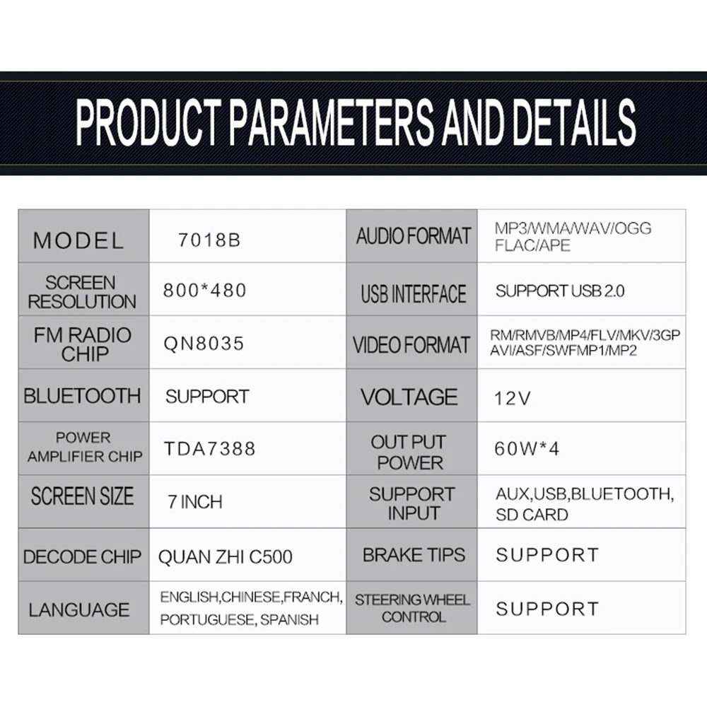 Важное Примечание перед установкой:1. Желтая линия (для провода памяти), подключенная к аккумулятору с постоянным током, устройство будет иметь функцию памяти.2. КрасныйЛиния выберите ключ к линии ACC, эта линия также положительная, контрольВыключатель питания. Черный провод подключен к отрицательному источнику питания.3. СинийЛиния подключения Поднимите антенну или сабвуфер REM линии управления, если нетНе подключены, обернуты прорезиненной тканью.4.Остальные восемь проводов (серый, белый, зеленый, фиолетовый)-это линия динамиков, группаЦветов, соответствующих паре динамических линий (положительных иОтрицательный).5. Пожалуйста, обратите внимание, чтобы проверить, является ли оригинальный автомобильКабель Динамика при контакте с железом (оригинальная автомобильная проволока для сваркиМеталл, или динамик только обтекаемый, называемый контактным железом).Свяжитесь с железом, потому что наша мощная машина без звука, пожалуйстаПроверьте его с помощью мультиметра перед установкой, если свяжитесь с утюгом, пожалуйстаОтсоедините, а затем установите.Дружеское напоминание:1.Нельзя использовать оригинальную автомобильную вилку, непосредственно подключенную к нашей новойМашина, не подходит, приведет к тому, что машина сгорела, частьМашина может быть разделена, пожалуйста, обратитесь в службу поддержки клиентов.2. Если вы покупаете продукт напряжения 12 В, не устанавливайте модели напряжения до 24 В, в противном случае это приведет к сгоранию машины.3.Когда проводка, акустический кабель и шнур питания вместе, вызовет короткоеЦепи, привести машину сгорел/не может загрузиться или машина безЗвук.Примечание: Эта машина 12 В, не в соответствии с источником питания 24 ВПосылка:1 X Bluetooth Автомобильный сенсорный экран монитор с MP5 плеером1 х Акустический кабель1 пульт дистанционного управления1 х Кабель питания1 x Руководство пользователя