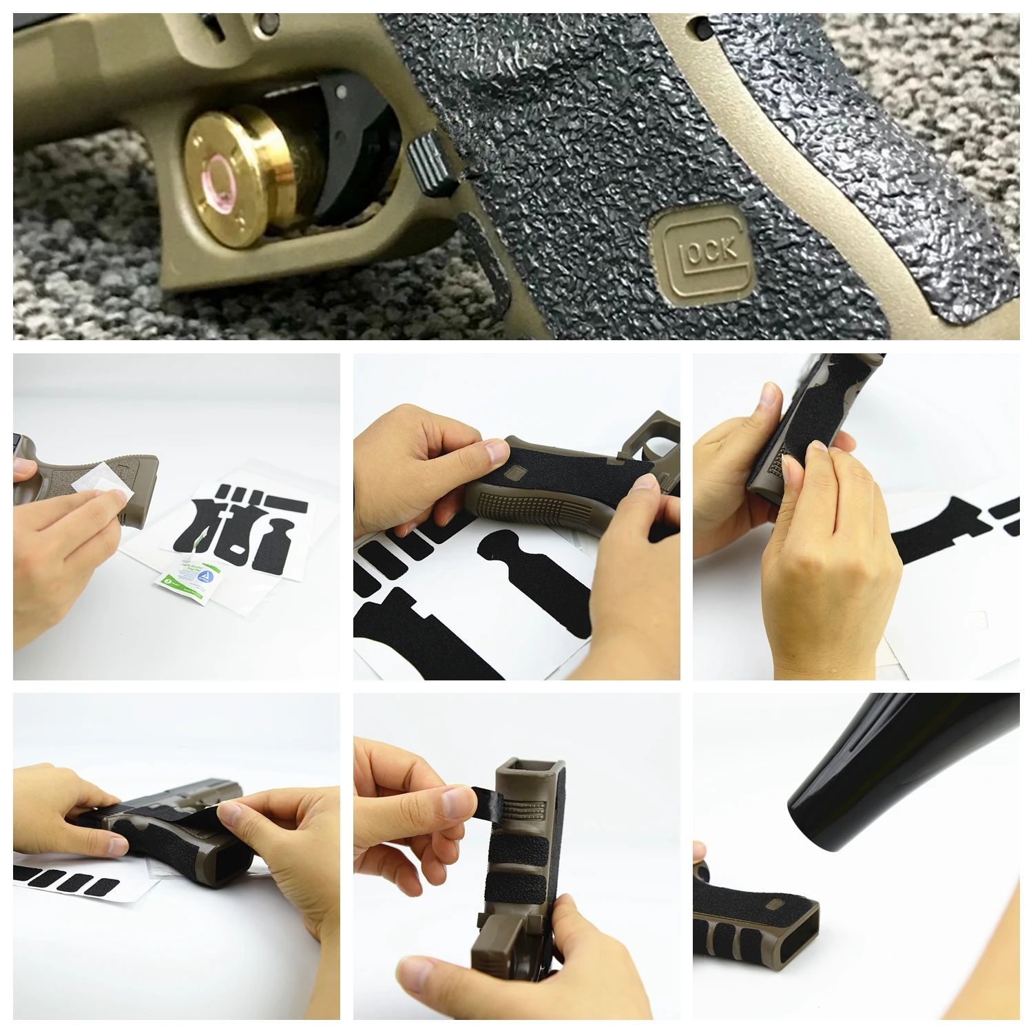 Наши ручки обеспечивают Полное покрытие на боковых панелях Включая Над большим пальцем, Конечно, включает Лента для канавок Или Glock Grip Лента для переднего ремешка И покрыть Резиновая лента с ремешком сзади. Используйте эту клейкую пленку для захвата, улучшая сцепление и стабильность вашего пистолета Glock.