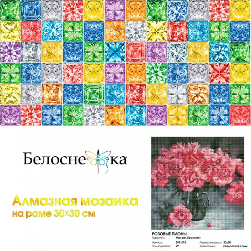 "Розовые пионы" Алмазная мозаика на подрамнике 30х30 см. Белоснежка. 595-ST-S