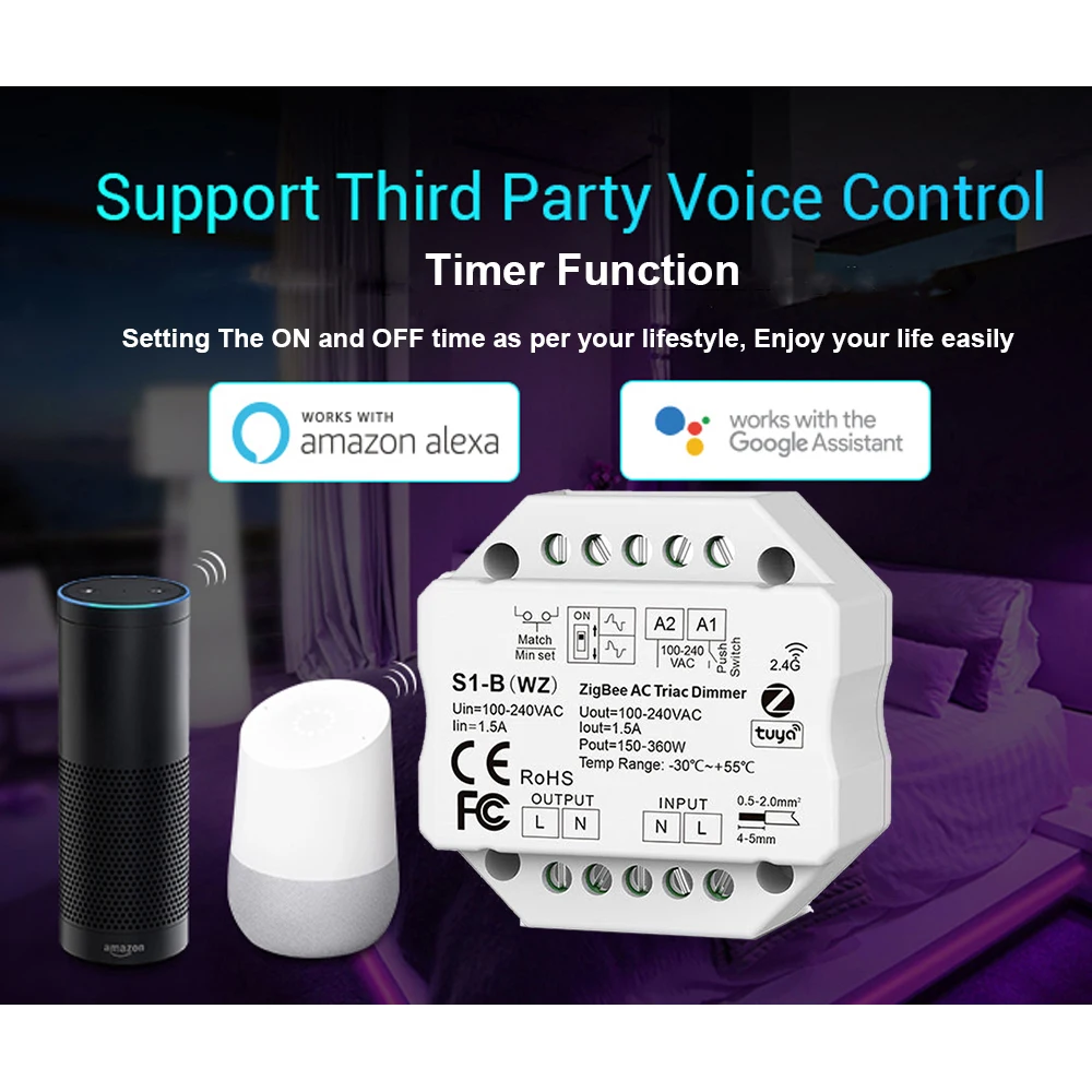 ● Модель: MJJC-S1-B(WZ) ● диммер ZigBee + RF + Push AC фазового кроя, выход 1 канала. ● Затемнять и включать одноцветные светодиодный лампы, традиционные лампы накаливания и галогенные лампы. ● Tuya APP Облачное управление, поддержка включения/выключения, регулировка яркости, Задержка включения/выключения светильник, Запуск таймера, функция воспроизведения сцены и музыки. ● 256 уровней 0-100% плавное затемнение без вспышки. ● Затемнение передних кромок или затемнение задних кромок устанавливается dip-переключателем. ● Минимальная яркость может быть установлена ключом. ● Совместимость с дистанционным управлением RF 2,4G с одной зоной или несколькими зонами затемнения. ● Каждый S1-B(WZ) контроллер может также работать как ZigBee-RF постоянного тока в переменный конвертер, затем Используйте приложение Tuya для управления одним или более RF затемнения светодиодный контроллер или драйвер одновременно. ● Подключите к внешнему кнопочному переключателю для обеспечения включения/выключения и 0-100% функции затемнения. ● Легко помещается в стандартную настенную распределительную коробку позади кнопочного выключателя. ● Защита от перегрева/перегрузки, восстановление автоматически. S1-B(WZ) ZigBee & RF AC ТРИАК диммер