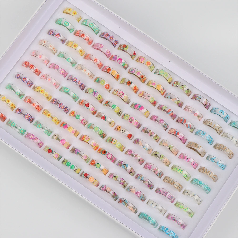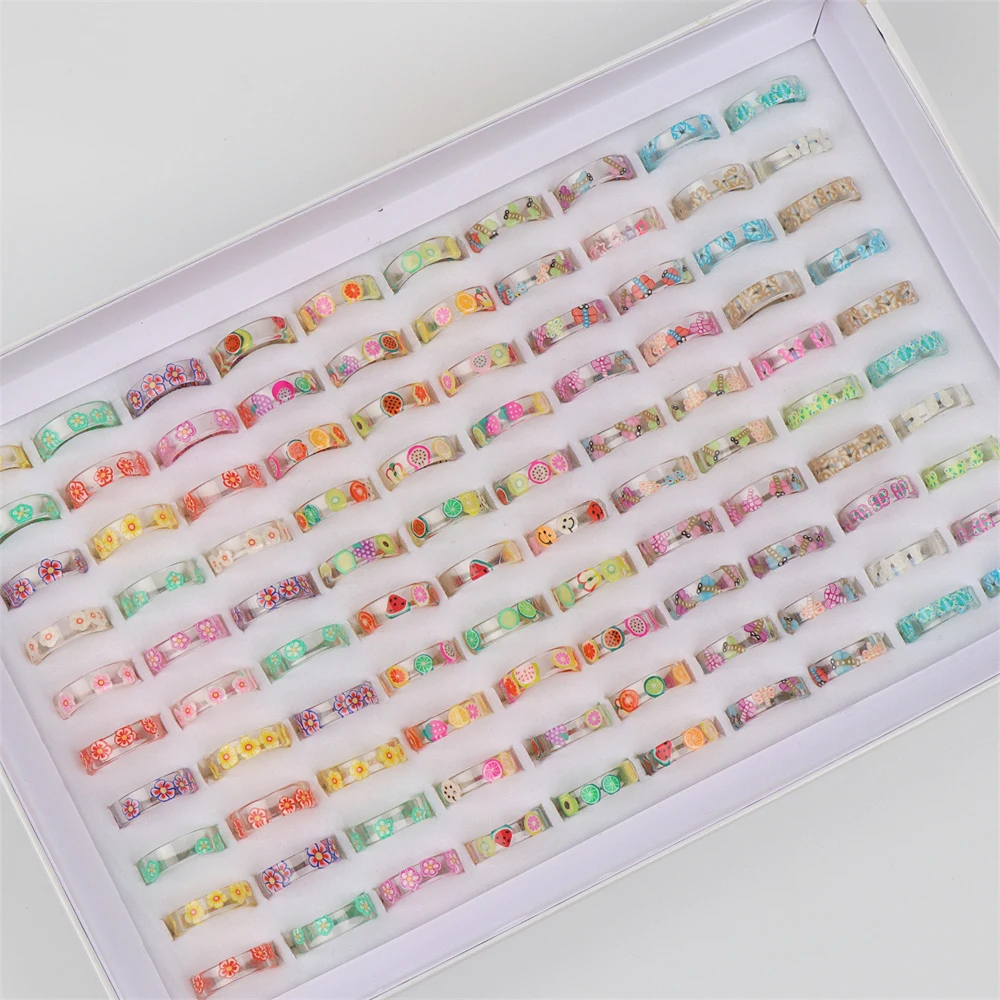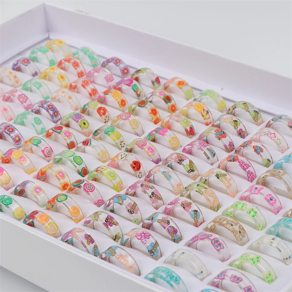 Оптовая продажа, 50 шт.лот, милые разноцветные кольца с фруктами, бабочками, цветами из смолы для женщин, смешанные стильные модные украшения, подарки Вечерние
