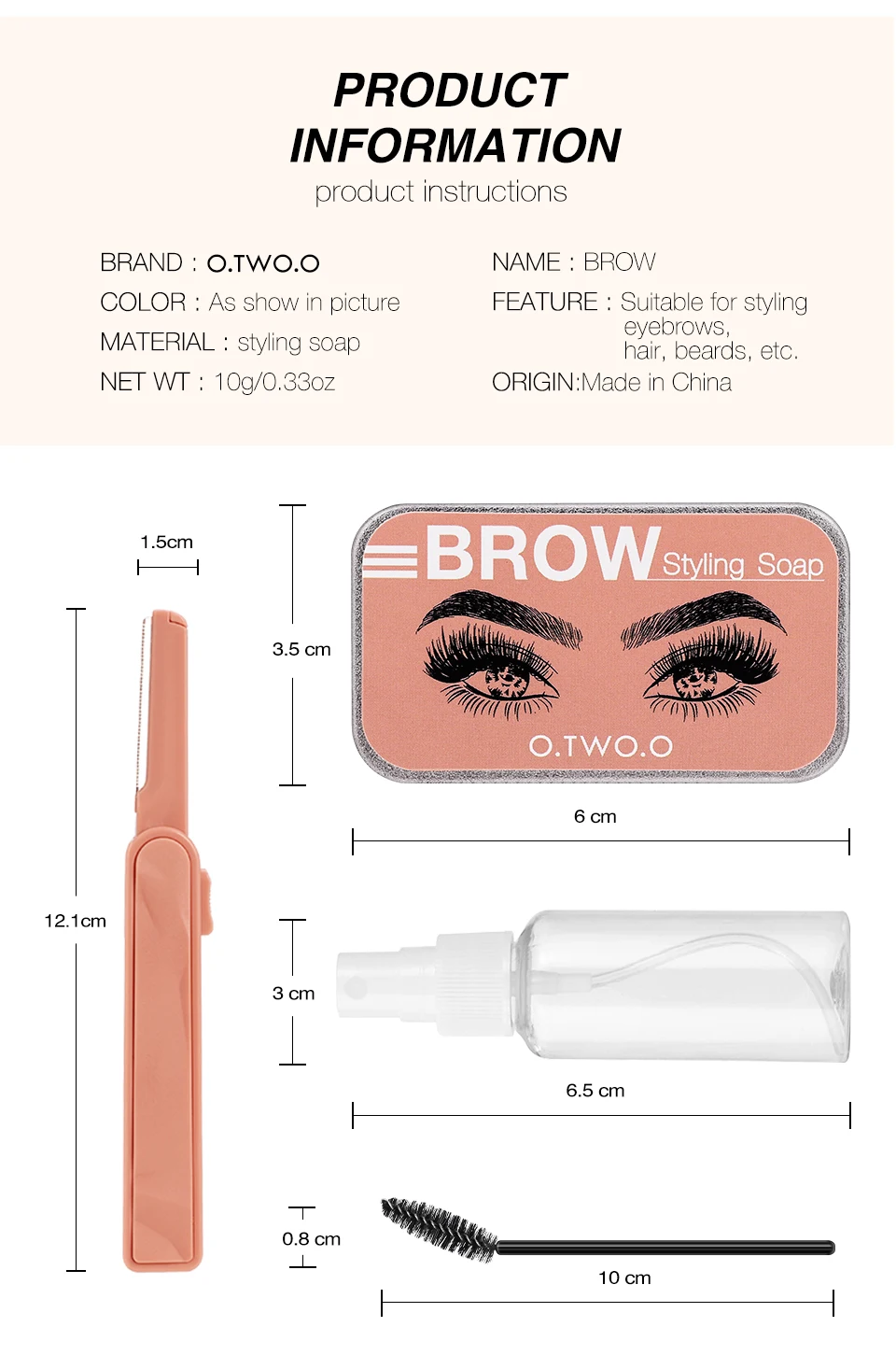【Упаковка list】:1 * брови мыло1 * спрей бутылка (новый добавить)1 * кисть для бровей1 * триммер для бровейИнструкции по использованию:1. Распылите головку щетки распылителем.2. Почистите мыло для бровей слегка влажной насадкой (количество умеренное, не слишком маленькое, не слишком большое, чтобы не прилипать)3. Повторите расчесывание бровей и пусть каждая бровь прилипает к установочному мылу, чтобы достичь установочного эффекта.4. Модифицированные края бровей, чтобы получить горячий дикий эффект бровей