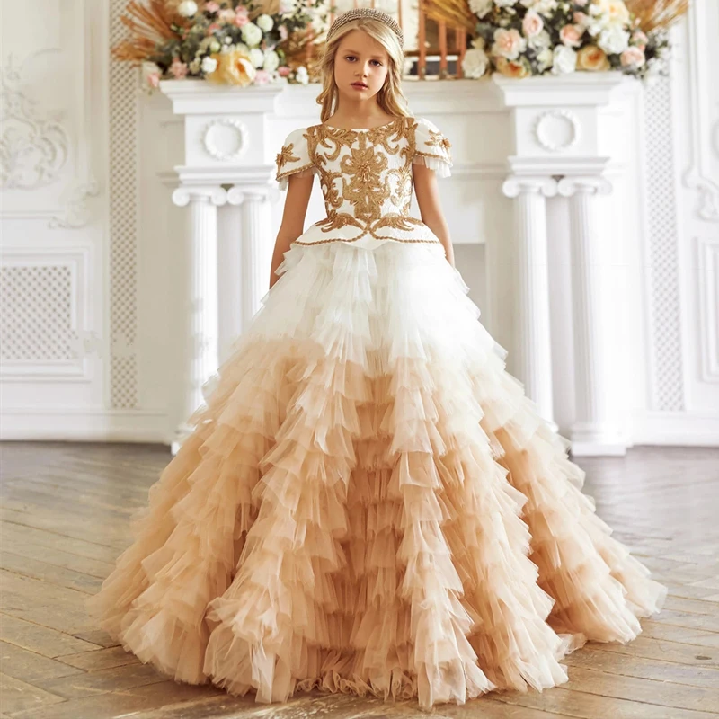 Платье для девочек, с многоярусными золотыми аппликациями, цвета шампанского