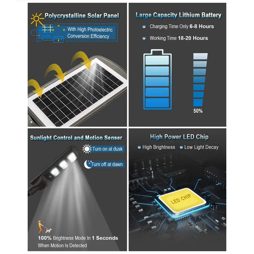 ◆ Индукционный режим: начинается автоматически в сумерках, автоматически закрывается на восходе солнца. Он обеспечивает более 48 часов непрерывного освещения после полной зарядки в дневное время.
