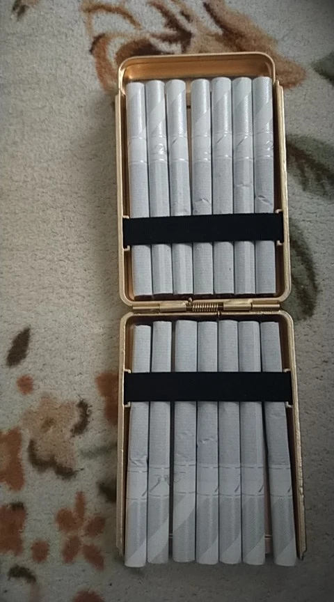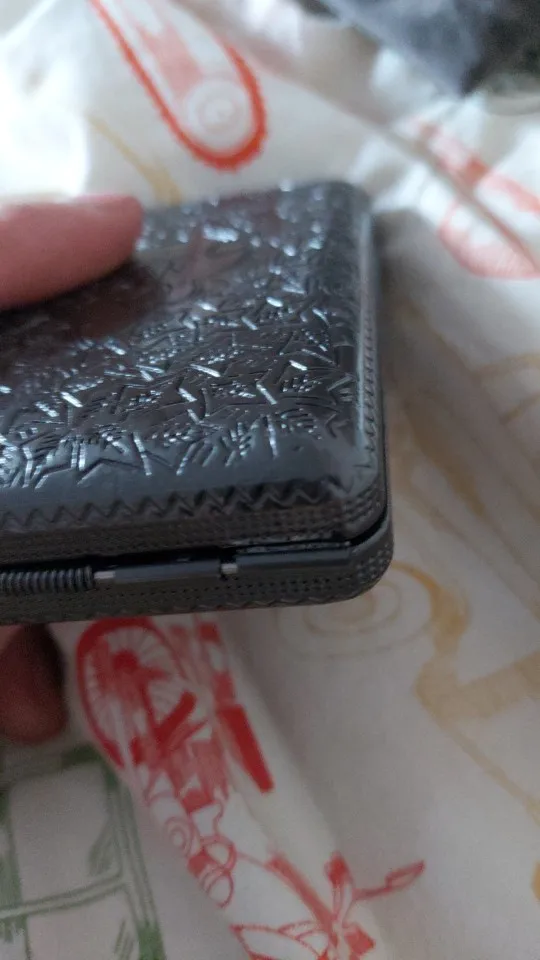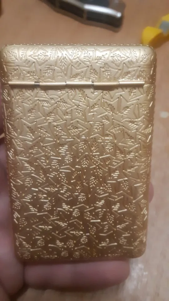 Очень хорошая сигаретная коробка. Он весит довольно тяжело, потому что он сделан из плотного металла. Я очень доволен этой покупкой. Я рекомендую товар и продавца.