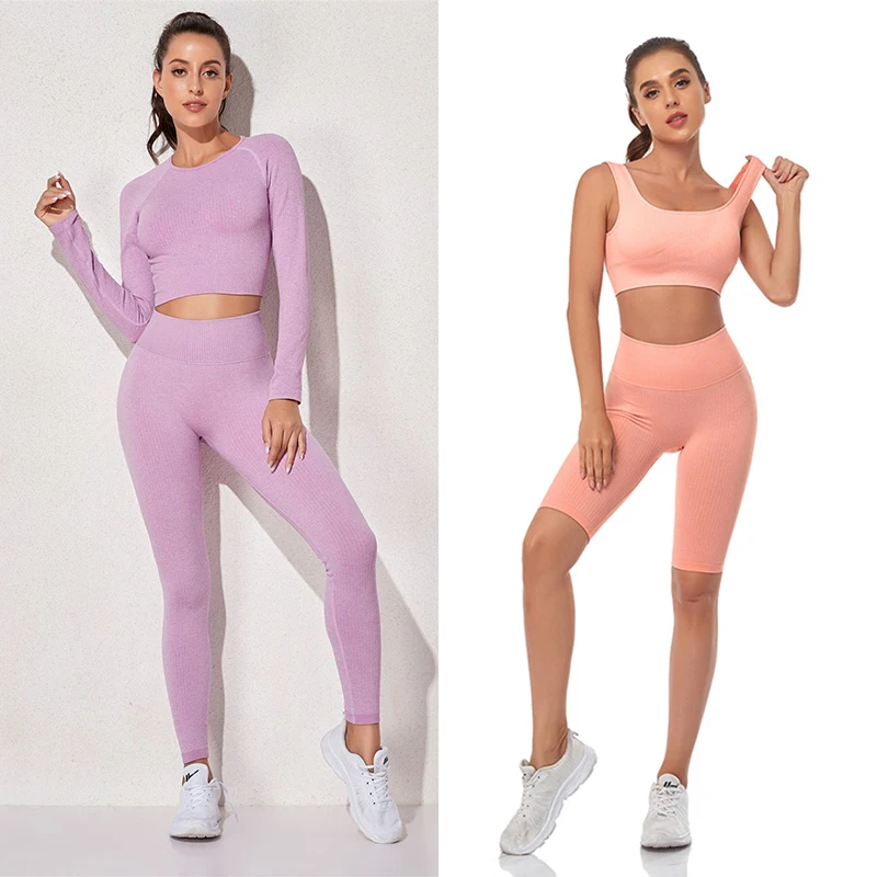 Женский бесшовный комплект для йоги, спортивные костюмы для фитнеса, одежда для тренировок в тренажерном зале, женские спортивные Леггинсы с высокой талией, Топ с длинным рукавом и Укороченный бюстгальтер