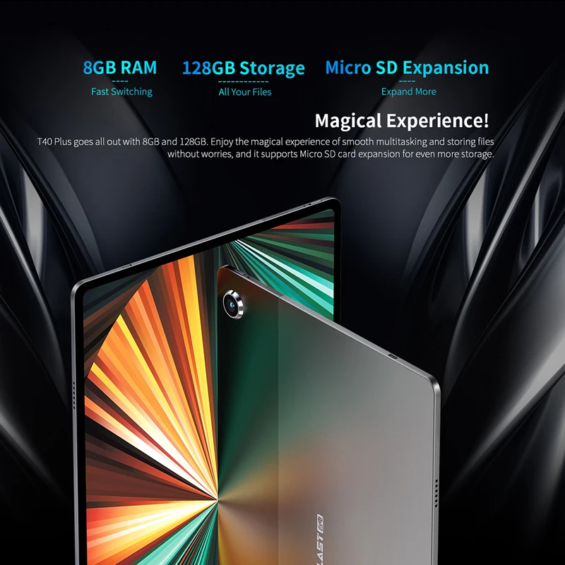 T40 Plus выпускается на 8 ГБ и 128 ГБ. Наслаждайтесь волшебным опытом плавной многозадачности и хранения файлов без беспокойства, и он поддерживает расширение карты Micro SD для еще большего объема памяти.