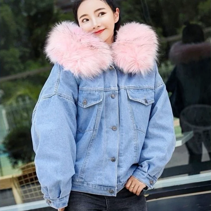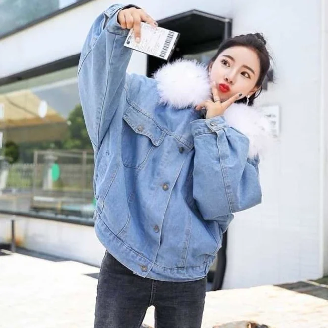Женская джинсовая куртка, свободная утепленная куртка с большим мех...