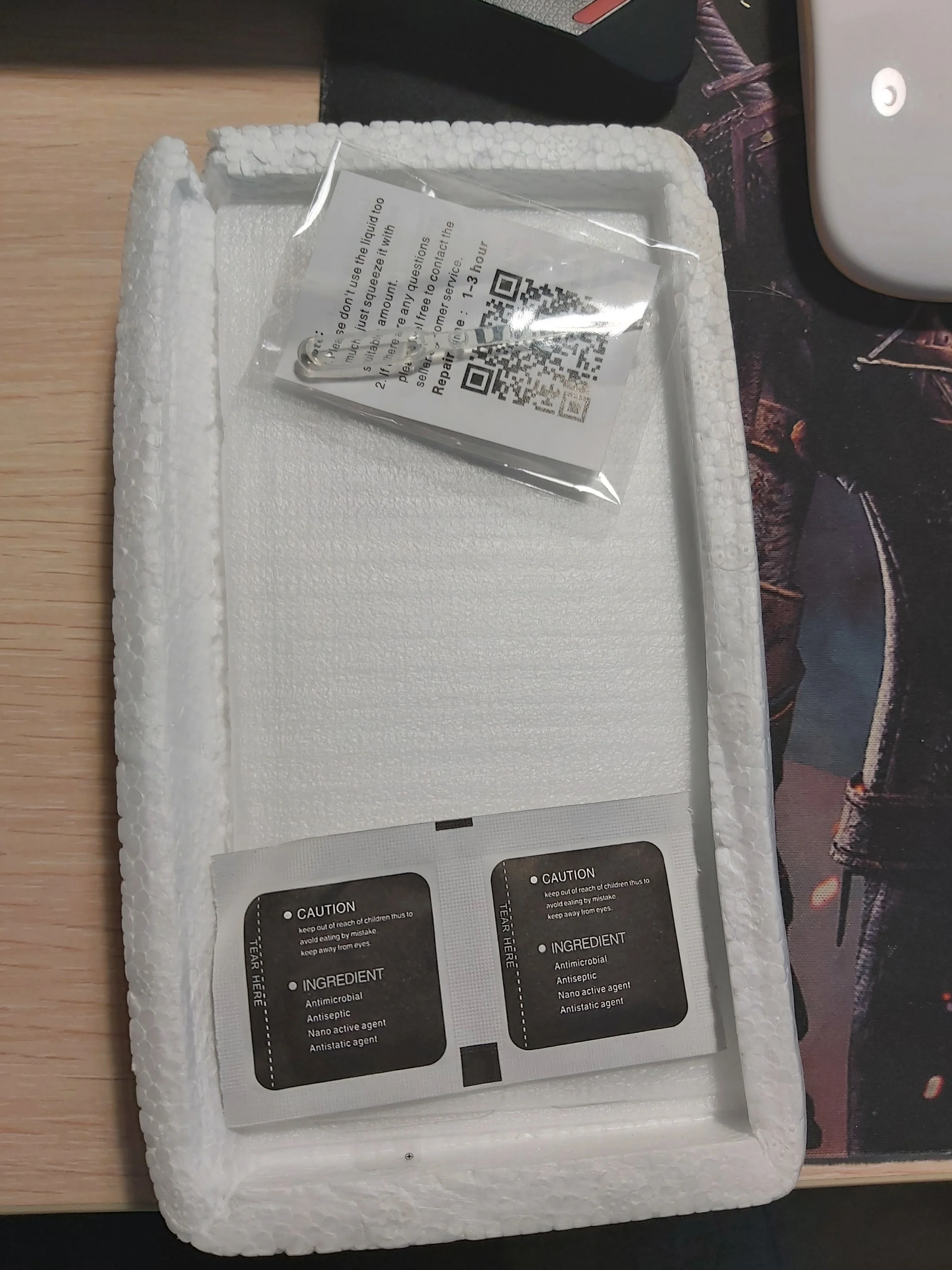 Нормальное стекло, влажные салфетки и дополнительный гель в пипетке. Все упаковано в пенопластовую коробку, удобно и безопасно. Клеится легко и чехол не задевает.