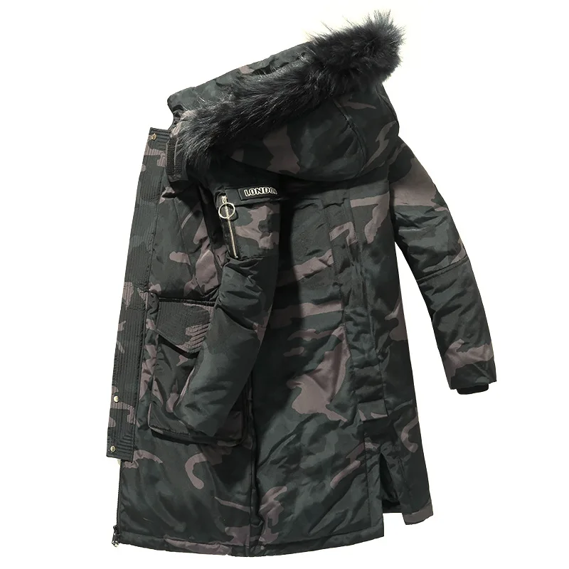 Мужские зимние длинные пуховики, толстые теплые парки, пальто, Повседневная камуфляжная ветровка с меховым воротником и капюшоном, белая куртка на утином пуху