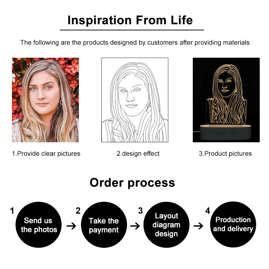 1. Разместите заказ, затем отправьте нам вашу фотографию и текст вместе. Так что мы можем разработать вашу индивидуальную 3d-лампу.2. Пожалуйста, укажите текст в заказе или отправьте нам текст в этом виде, текст: XXX, шрифт: XXX.3. Пожалуйста, также оставьте свои слова в подарочной карте.4: индивидуальный продукт-это индивидуальный продукт, поэтому мы не поддерживаем отмену заказов. Пожалуйста, убедитесь, что у вас достаточно времени, чтобы подождать, прежде чем сделать заказ (мы можем отправить ваш заказ в течение 3-5 рабочих дней). Спасибо за понимание.