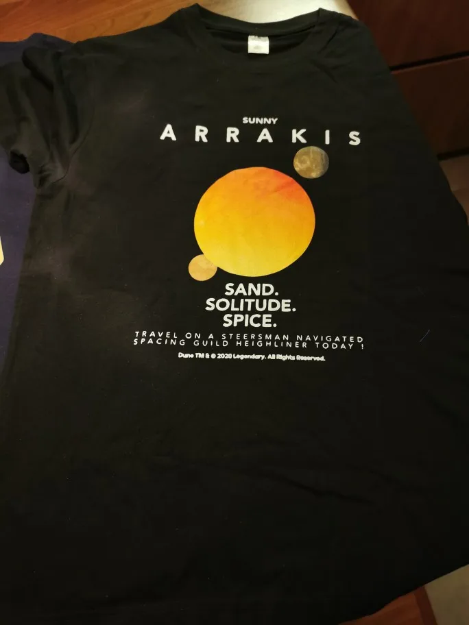 Пришел довольно быстро. Размер 3XL подходит для меня: 1,92 м (6 '3,5 ") и 87 кг. (192 фунтов) Мягкая ткань, хлопок, немного более «тянущаяся», затем «он контролирует spice контролирует мир», продавец также продает. Принт выглядит так, будто он будет продолжать.