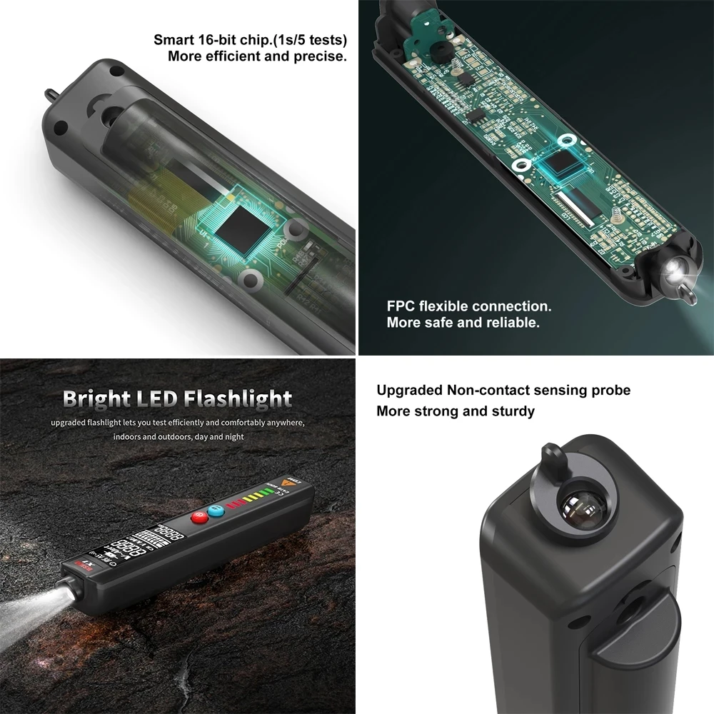 Ультрапрозрачный дисплей EBTN, прозрачный и легко читаемый.Бесконтактный дизайн в форме ручки, удобный в эксплуатации и переноске.Два режима работы. (низкая чувствительность и высокая чувствительность)Имеет индукционную опасную сигнализацию напряжения, напряжение постоянного тока/переменного тока, сопротивление, частоту, прямое/нейтральное различие провода, местоположение точки останова провода, проверку непрерывности, характеристики фонарика и т. д.Имеет 8 светодиодный индикатор в 3 цветах (красный/желтый): Автоматическая идентификация высокого/среднего/низкого напряжения.Режим сигнализации: звук, аналоговая полоса и светильник (красный/желтый).Светодиодный прожектор, напоминание о низком напряжении батареи, Автоматическое отключение питания.Уровень безопасности: CAT II 600V.Соответствие международным стандартам безопасности.