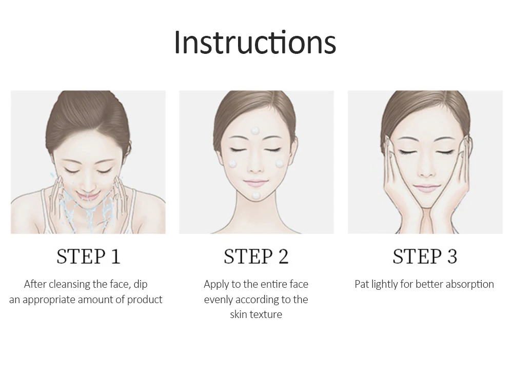 После очищения лица окуните соответствующее количество продуктаНанесите на все лицо равномерно в соответствии с текстурой кожиСлегка погладьте для лучшего поглощения