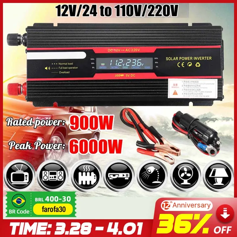 Посылка включает в себя:1 * Солнечный инвертор1 * пара кабеля для аккумулятора с зажимом типа «Аллигатор»1 * кабель прикуривателяХарактеристики:-Мощность пиков: 6000 Вт-Номинальная мощность: 900 Вт (пожалуйста, убедитесь, что Номинальная мощность выше, чем электрическое устройство, к которому вы хотите обратиться).-Входное напряжение: 12 В или 24 В-Выходное напряжение: 220 В переменного тока/50 Гц ± 3 ГцAC 110 В/60 Гц ± 3 Гц-Выход USB: 5V-2A-Нет тока нагрузки: <0.9A-Цифровой Дисплей: ЖК-дисплей входного/выходного напряжения-Форма выходного напряжения: модифицированная Синусоидальная волна-Эффективность преобразования: 90%Внешний вид-Модель: SBD-2000A-Цвет: черный-Материал: алюминиевый сплав-Тип разъема: Универсальная Розетка-Встроенный вентилятор охлаждения с низким уровнем шума.-Usb-интерфейс для зарядки.-Положительный и отрицательный полюсный терминал-Рабочая индикаторная лампа-Ручной выключатель инвертора-Размер: около 27.5x11x5.5см/10,8 "x 4,3" x 2,2"Особенности:-Инвертор может преобразовывать DC12 / 24V в AC 110V/220V.-12 В, как правило, для автомобилей, 24 В для грузовиков.-Доступный Диапазон номинального напряжения электроприборов: 210 ~ 230 В, 110 ~ 130 в-Безопасный Диапазон входного напряжения:Подходит для: ① 12V: 9,8 ~ 15В② 24 В: 20 ~ 28 в-8 функции защиты:①Reverse защита от обратной полярности②Защита от низкого входного напряжения③ Защита от высокого входного напряжения④ Защита от перегрузки по току⑤Short защита от короткого замыкания⑥Over защита от высоких температур⑦Overload защиты⑧External или внутренний предохранителиПрименение:-Применимые нагрузки для номинальной мощности 900 Вт:10w-цифровая ЭлектроникаСветодиодная лампа 20 Вт60w-компактная люминесцентная лампаЛампа накаливания 60w-60w-механический электрический вентилятор100w-нелазерный принтерНастольный компьютер 200w-200 Вт-32 дюймовый ЖК-телевизор300w-аудио усилитель оборудования300w-электрическая Ручная Мельница300w-электрическая ручная дрель350w-нелазерный принтер350w-ламинатор500 Вт-рисоварка600w-обогреватель600w-пылеочиститель800w-интеллектуальная рисоварка800w-соковыжималка-Неприменимые нагрузки для номинальной мощности 900 Вт:1000 Вт-индукционная плита1000w-сушилка для волос1200w-электрический чайник1400w-паровой Утюг2000w-сушилка для волосПримечание:①Пожалуйста, убедитесь, что Номинальная мощность выше, чем электрическое устройство, к которому вы хотите обратиться.②И если вы хотите запускать несколько устройств одновременно, вы должны обратиться к общей ватте.③ Если вы хотите работать с индуктивной нагрузкой в течение длительного времени, рекомендуется купить инвертор чистой синусоидальной волны.