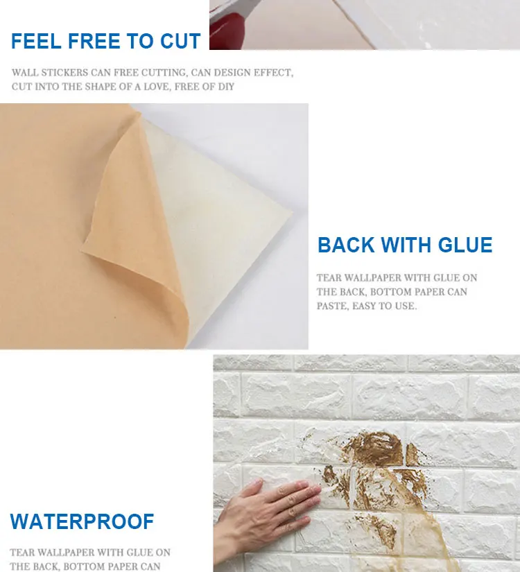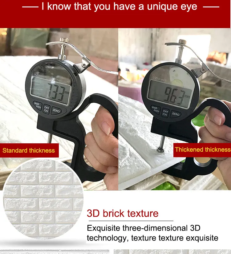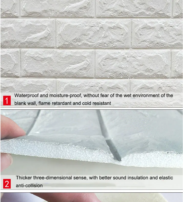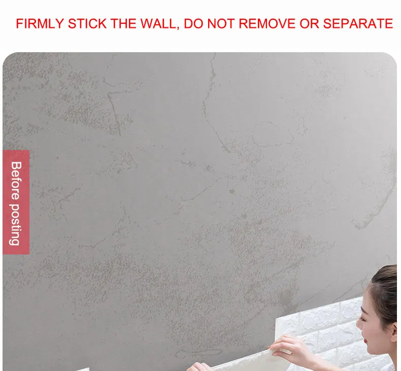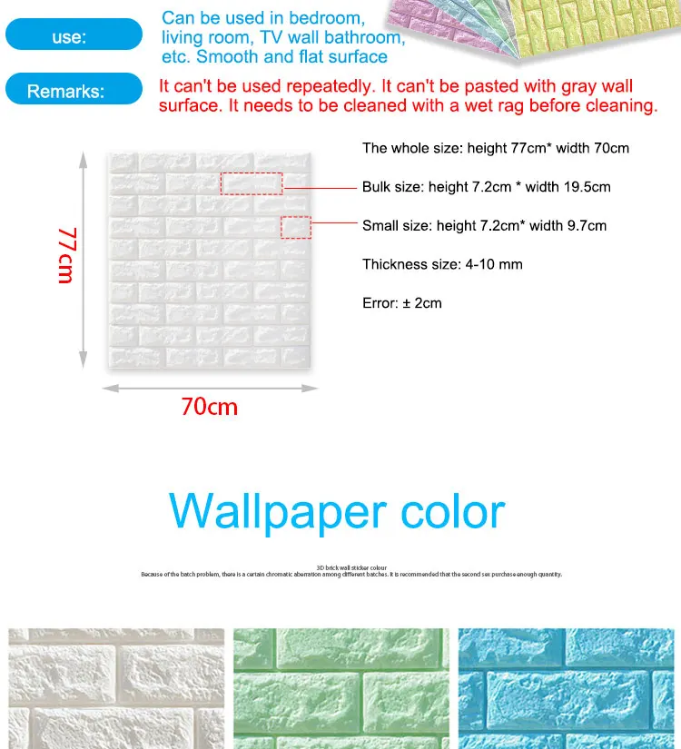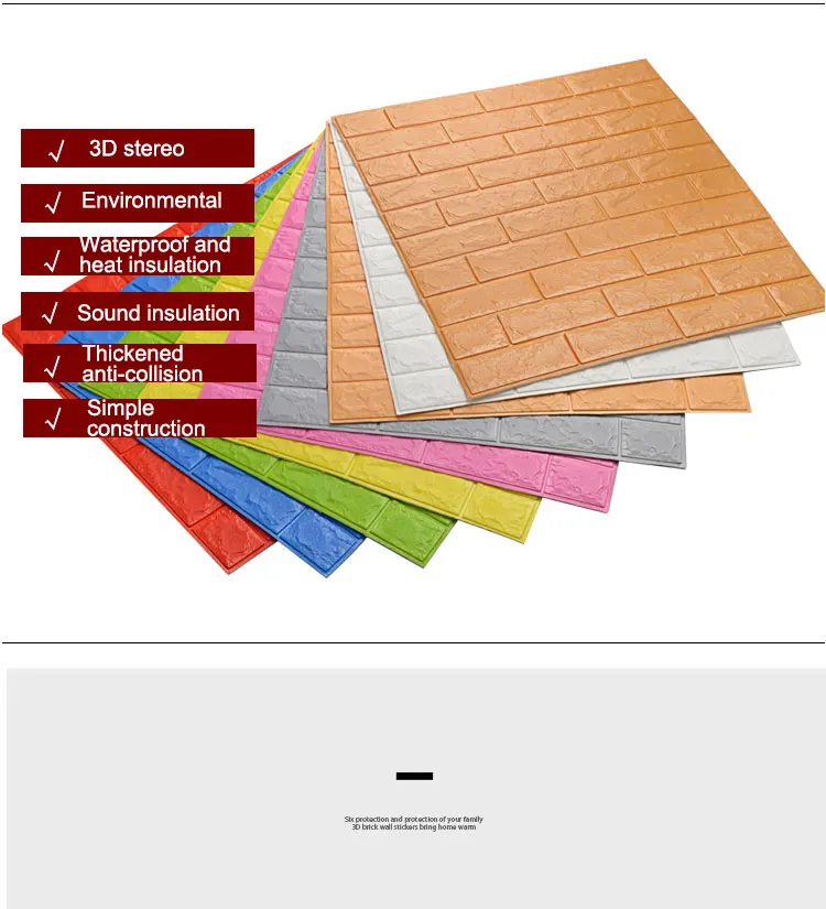 Характеристика:1: трехмерная декоративная мягкая пена, защита от столкновений для детей, забота о вашей семье.2: Безопасность и защита окружающей среды, нетоксичный запах, подходит для семейного безопасного домашнего пространства.3: Реалистичный, естественный эффект кирпичного узора, простой и современный стиль.4: Бесплатный DIY, простой самоклеящийся дизайн, установка, повседневный коллаж, произвольный крой.5: сравнение обоев с улучшенным эффектом шумоподавления.Способы установки и инструментыПодготовка: Очистите поверхность с адгезией, например: поверхность из дерева, поверхность из стекла, не Пылезащитная стена, нажмите на дно шпатлевки и так далее.Паста: на заднюю крышку разорвана бумага, приклеенная К вспомогательным инструментам: ножницы, ножВнимание: пожалуйста, купите достаточное количество единиц товара, чтобы убедиться, что они поставляются из одной партии, чтобы избежать разницы в цвете.