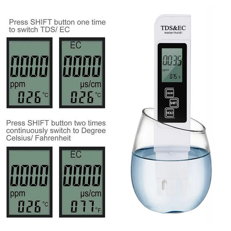 4 режима отображения: Нажмите кнопку SHIFT: TDS - ppm & °C, EC - µs/cm & °C, TDS - ppm & °F, EC - µs/cm & °F.