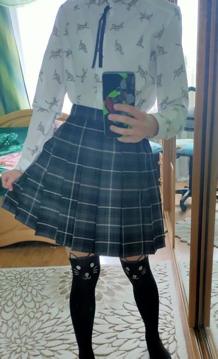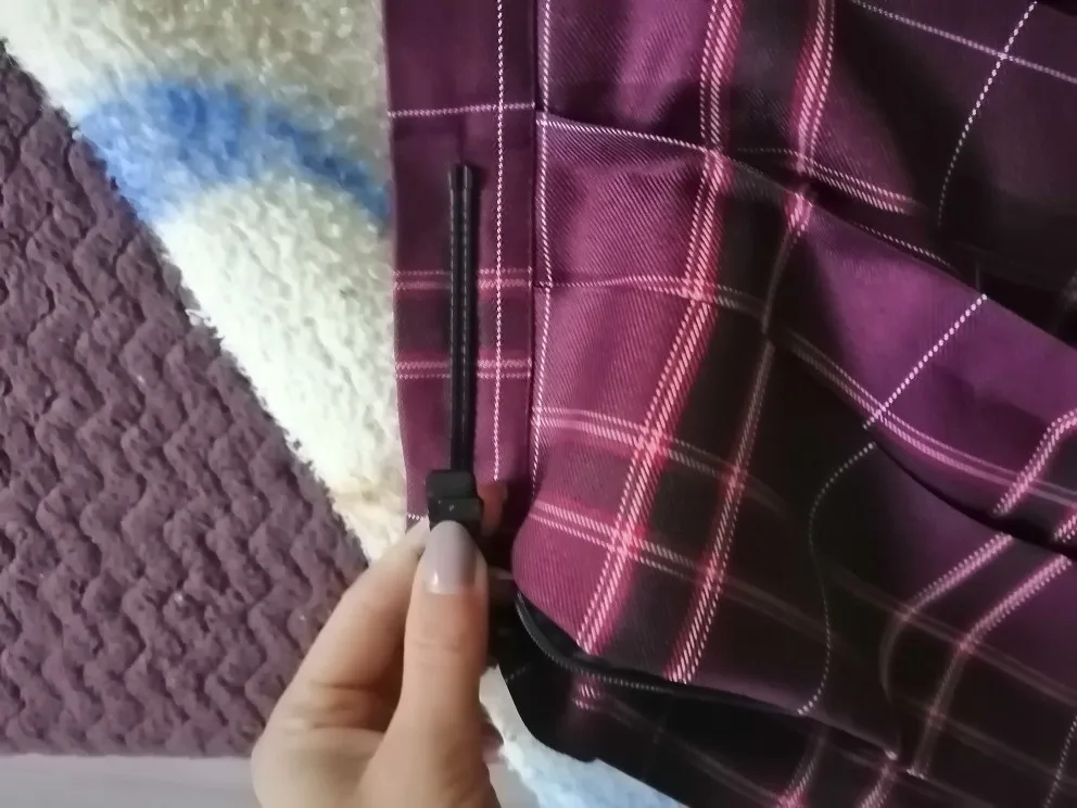 Сначала нижняя часть юбки была пришита белыми нитями, по всей видимости, чтобы складки не блестели. Замок скрывает за складкой ткани, поэтому он совсем не заметен. Все еще есть регулировка на талии с помощью черной «застежки», так что вы можете сказать, что юбка подходит несколько размеров, вероятно. Длина выше колена.