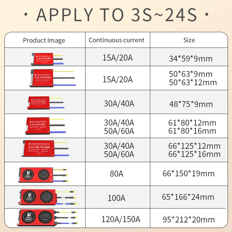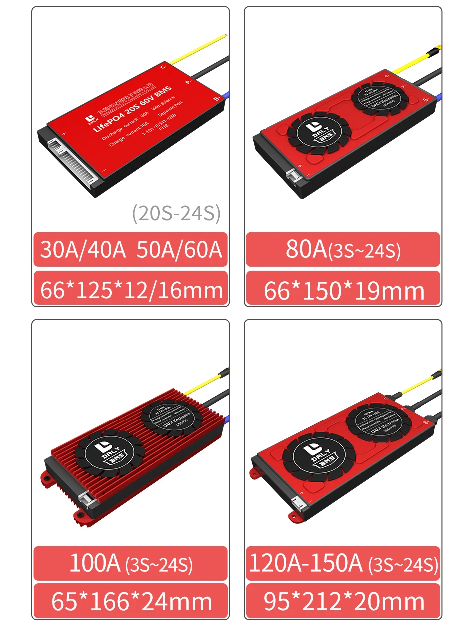 ◆Для той же модели, его ток заряда меньше, чем ток разряда, потому что Daly PCBAs были обновлены, чтобы хорошо защитить батарею клиента.