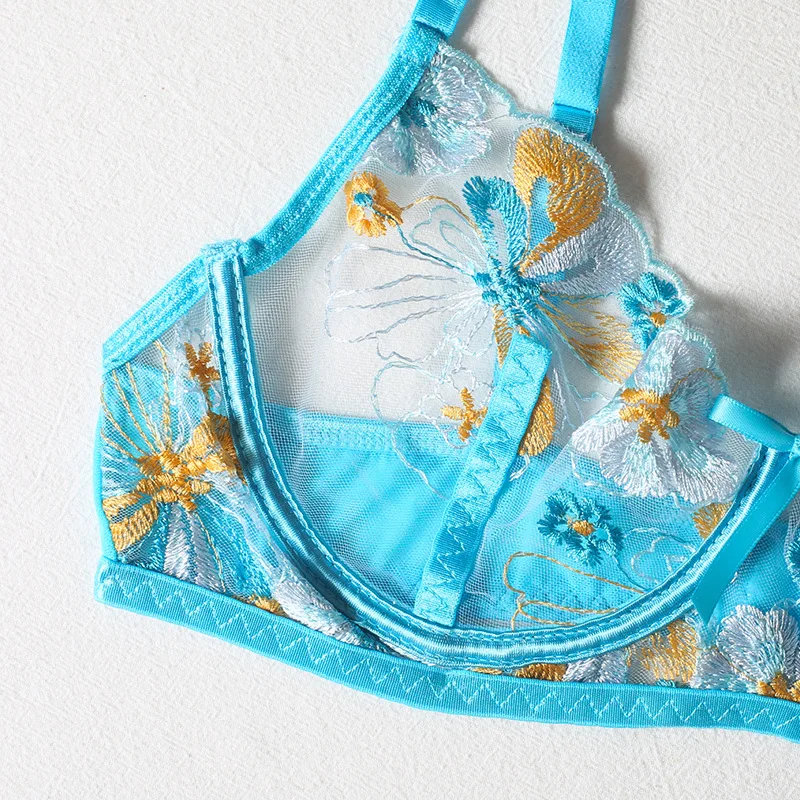 Новый комплект из 3 предметов с бюстгальтером, Женская кружевная Цветочная вышивка, синий комплект нижнего белья, женский прозрачный бюстгальтер + искусственное нижнее белье