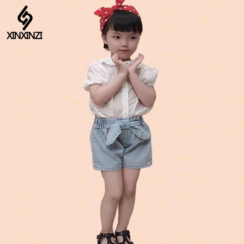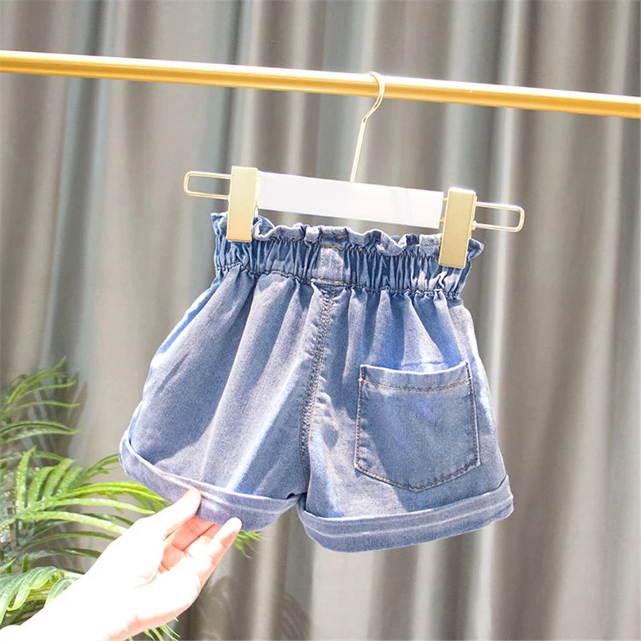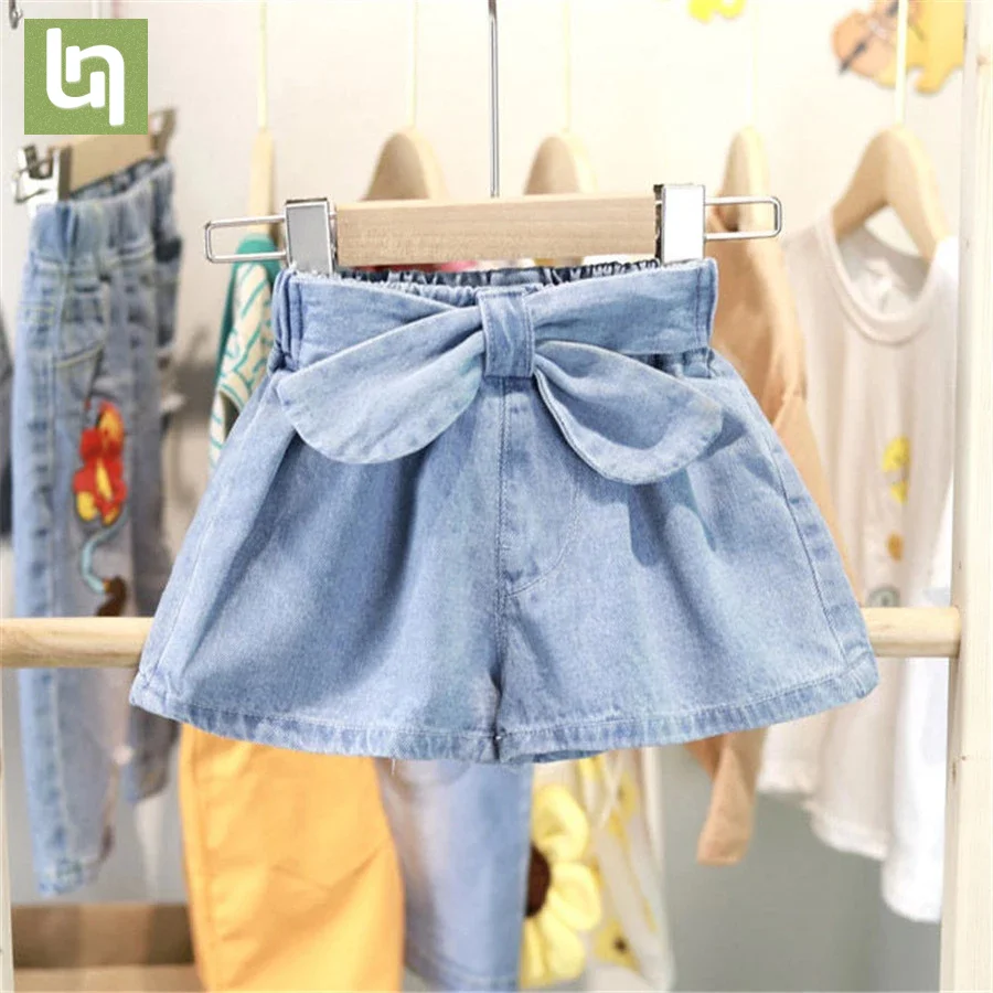 Летние модные мягкие джинсовые шорты для маленьких девочек с бантом, джинсовые брюки, детские повседневные брюки, детские шорты, детская одежда для 24 мес.-7 лет