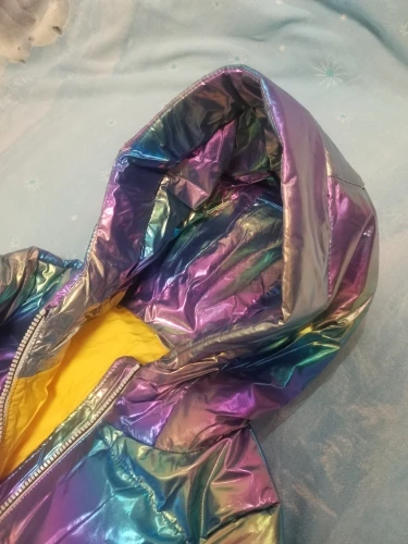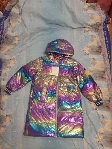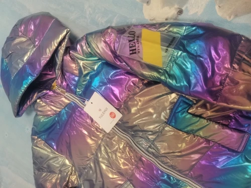 Симпатичное пальто. Не знаю на сколько тёплое конечно… При искусственном свете не так сильно переливается а так все как на фото. В подарок положили резиночка для волос. Спасибо!