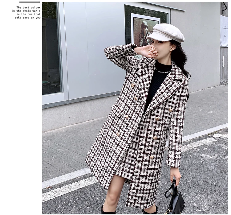 Женский твидовый комплект из 2 предметов, шерстяной костюм с воротником с лацканами и твидовым клетчатым коротким жакетом на осень и зиму
