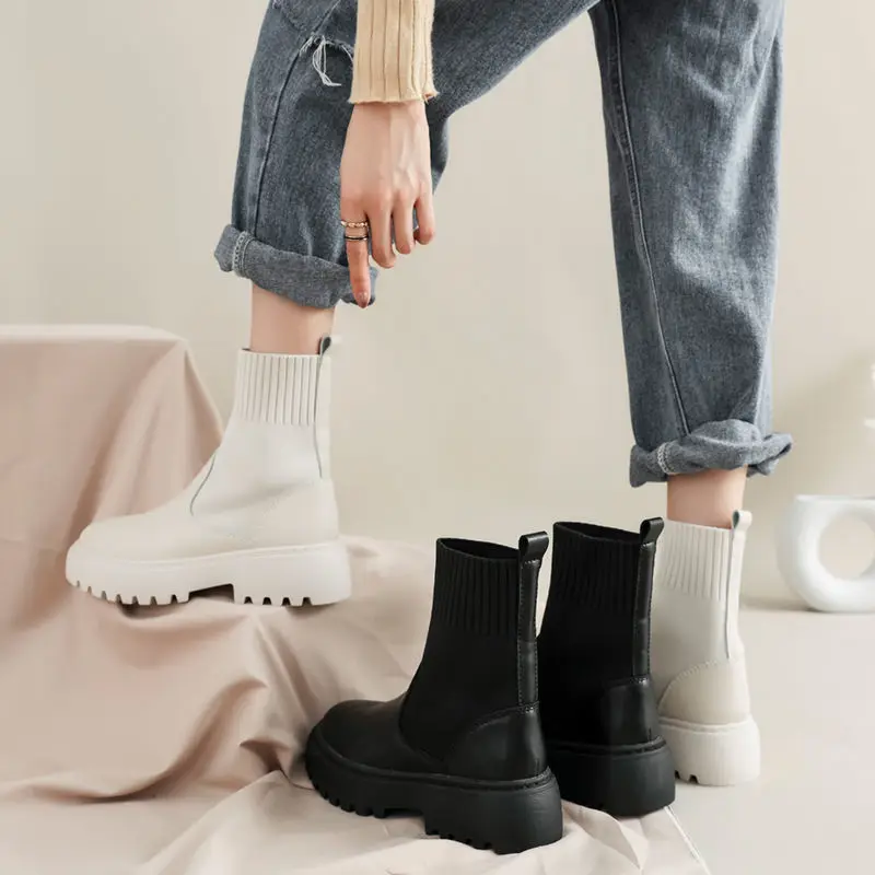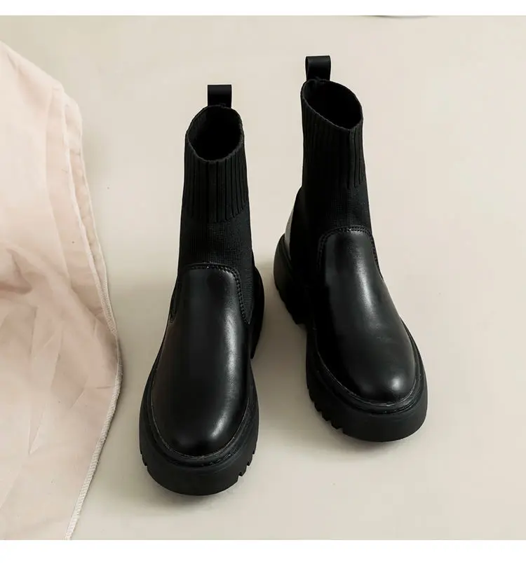 Ботильоны женские, слипоны, женская модная вязаная эластичная обувь с круглым носком, короткие ботинки на платформе и квадратном каблуке, кожаные ботинки для женщин