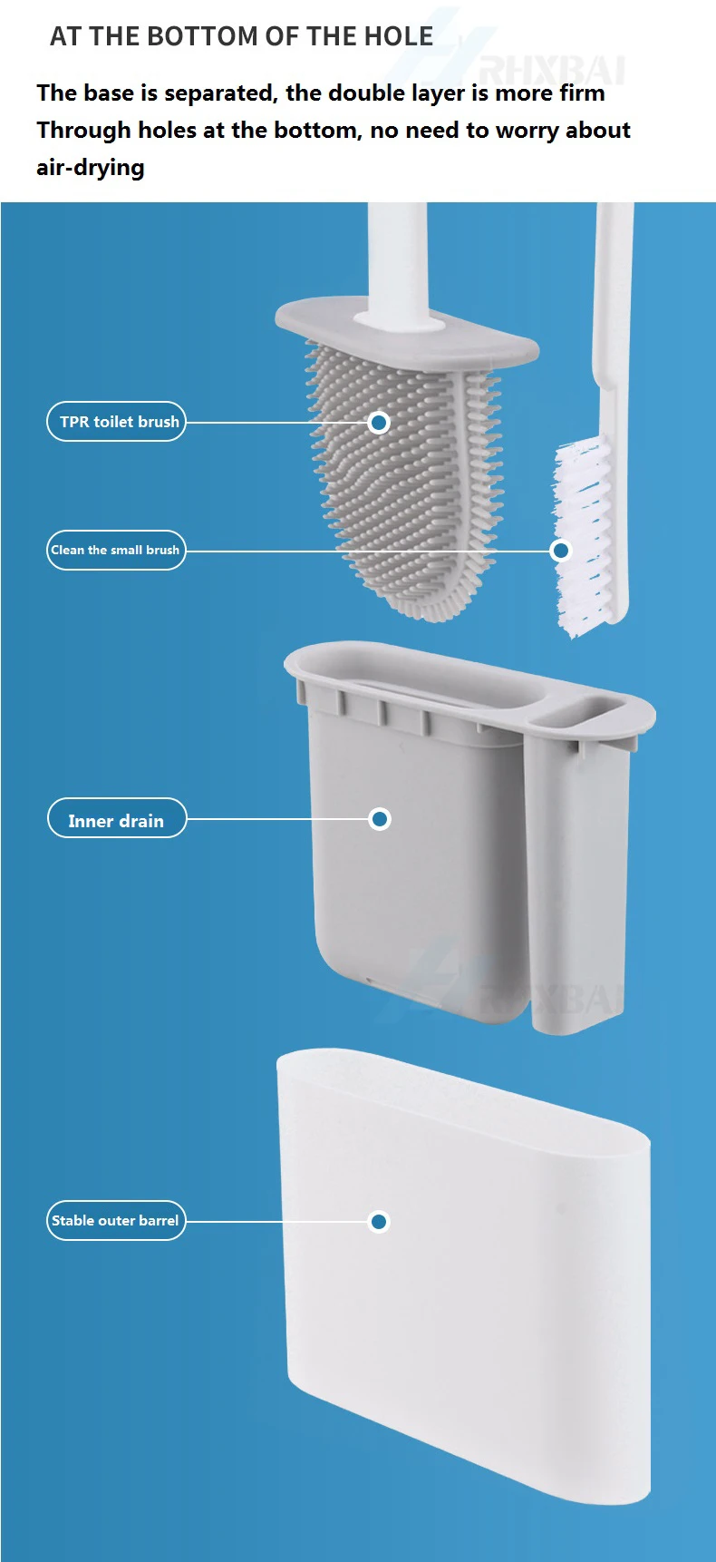 Мягкие TPR, силиконовые щетины обладают хорошей чистящей способностью, могут войти в край унитаза, Глубокая чистка, не повредит эмаль. Плоская головка кисти может быть согнута так, чтобы она полностью соответствовала углу обода и доходила до нижней части обода. Наконечник головки щетки предназначен для лучшей очистки обода унитаза, сгибая головку щетки вверх.