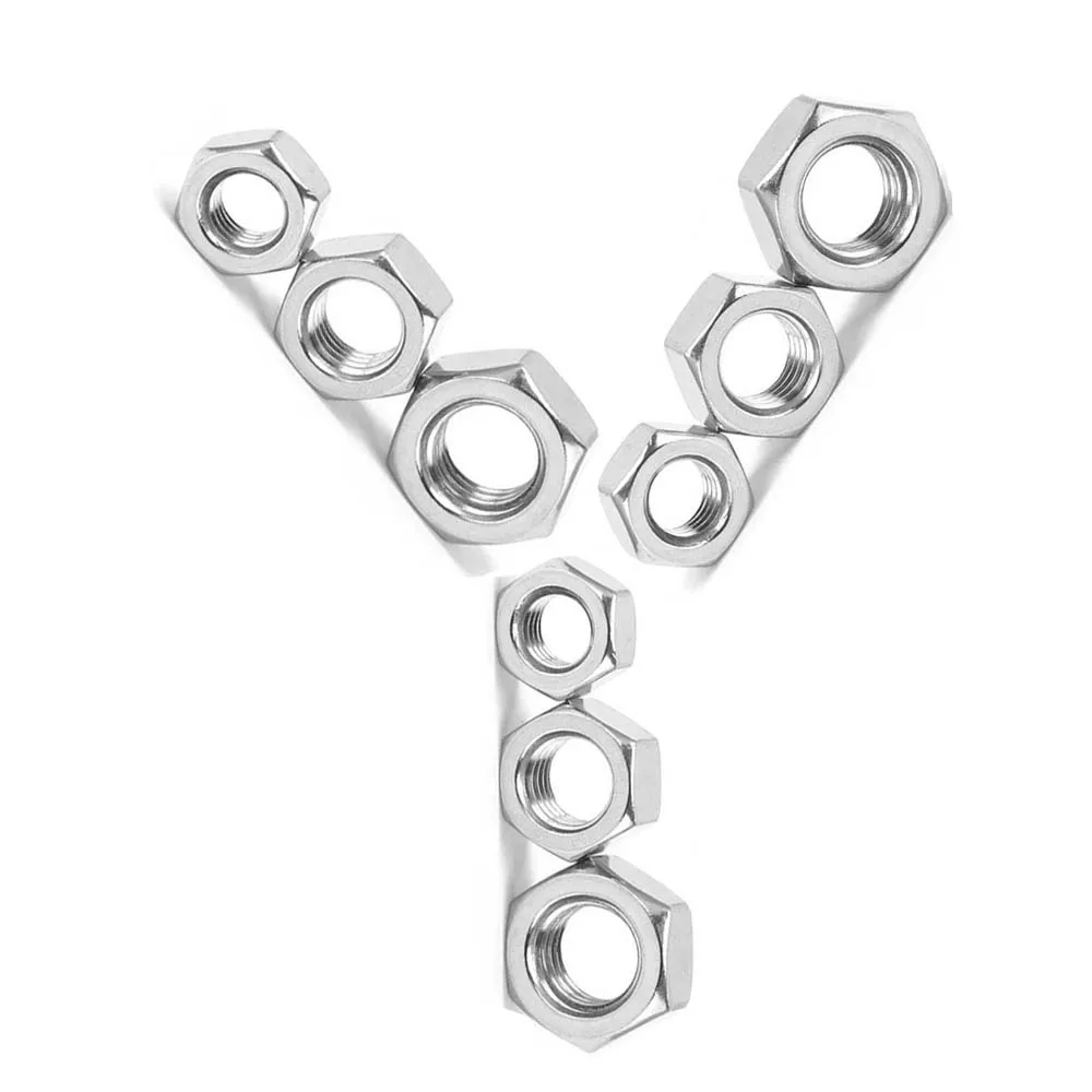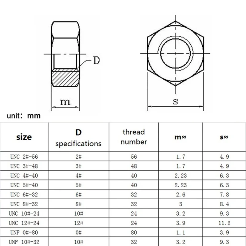 US грубая тонкая резьба Шестигранная гайкаМатериал: нержавеющая сталь 304(A2-70)Размер грубой резьбы США:2 #-56 / 3 #-48 / 4 #-40 / 5 #-40 / 6 #-32 / 8 #-32 / 10 #-24 / 12 #-24Американский размер тонкой резьбы:#0-80 / 10 #-32
