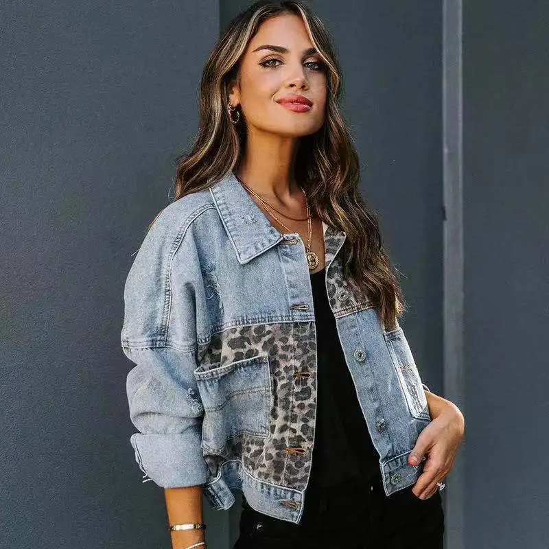Женская джинсовая куртка с леопардовым принтом и длинными рукавами