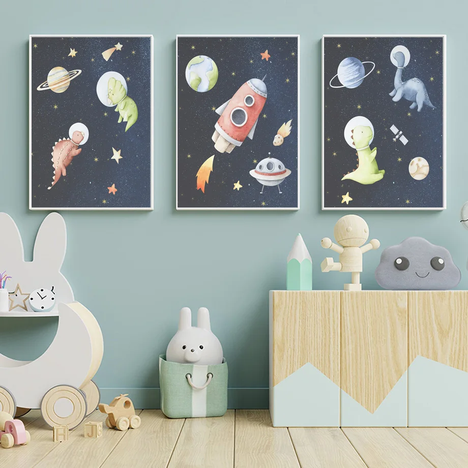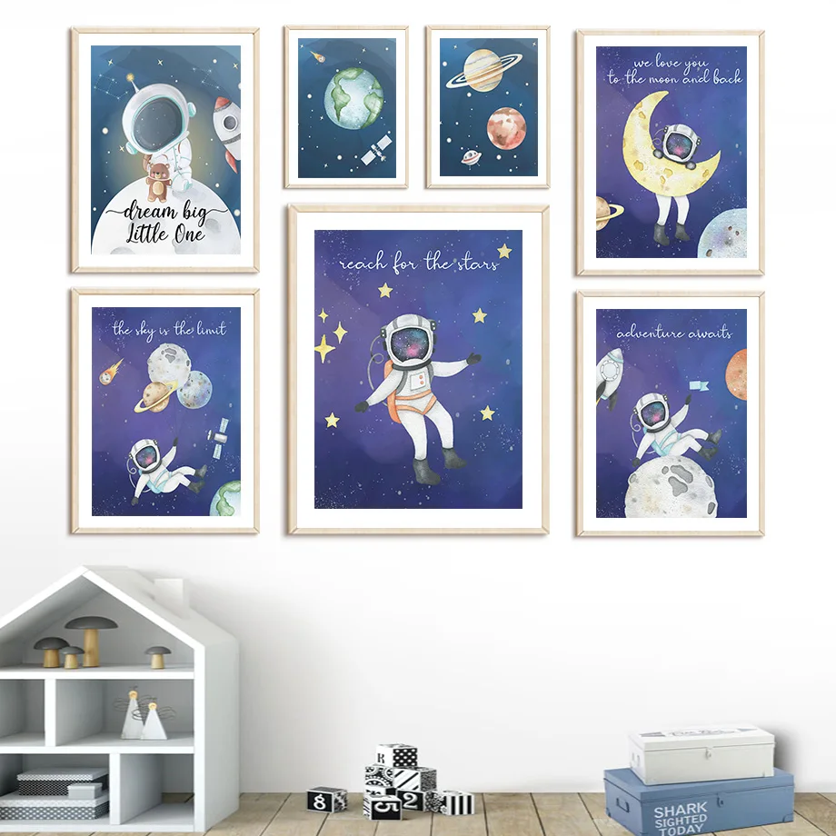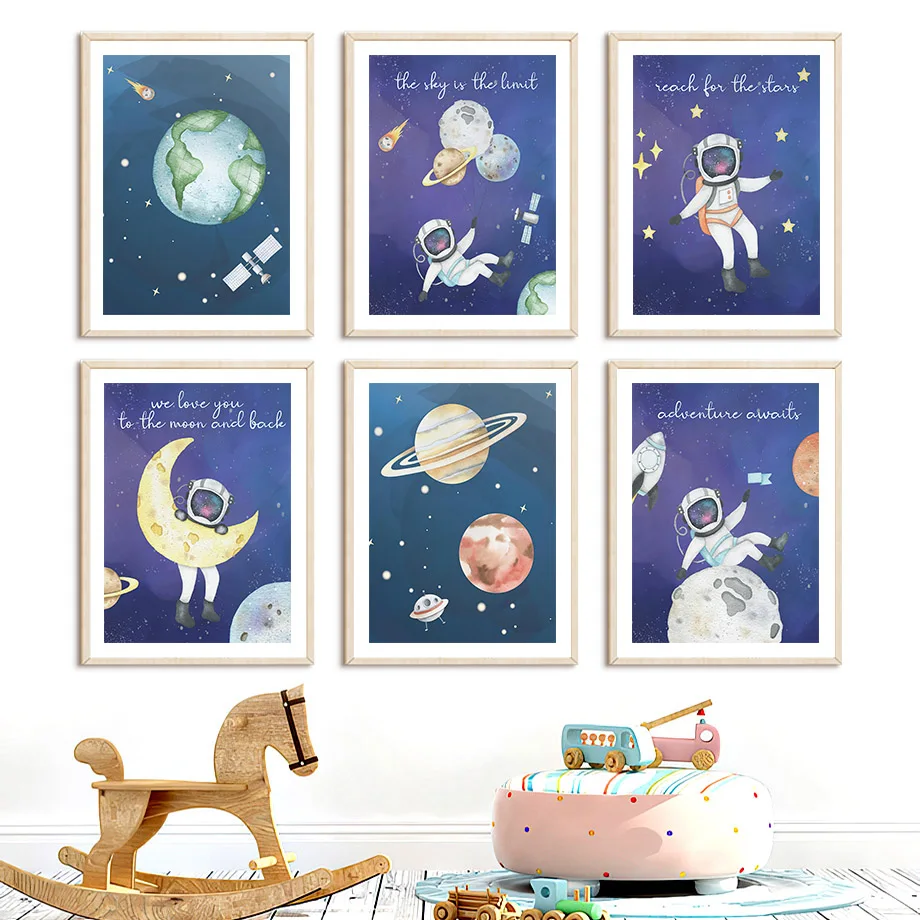 Астронавт, планета, космос, луна, звезды, настенное искусство, холст, живопись, скандинавские Детские плакаты и принты, настенные картины для мальчиков, детская комната, ДекорМатериал: экологически чистый хлопокХарактеристика: солнцезащитный, водонепроницаемый, никогда не выцветает