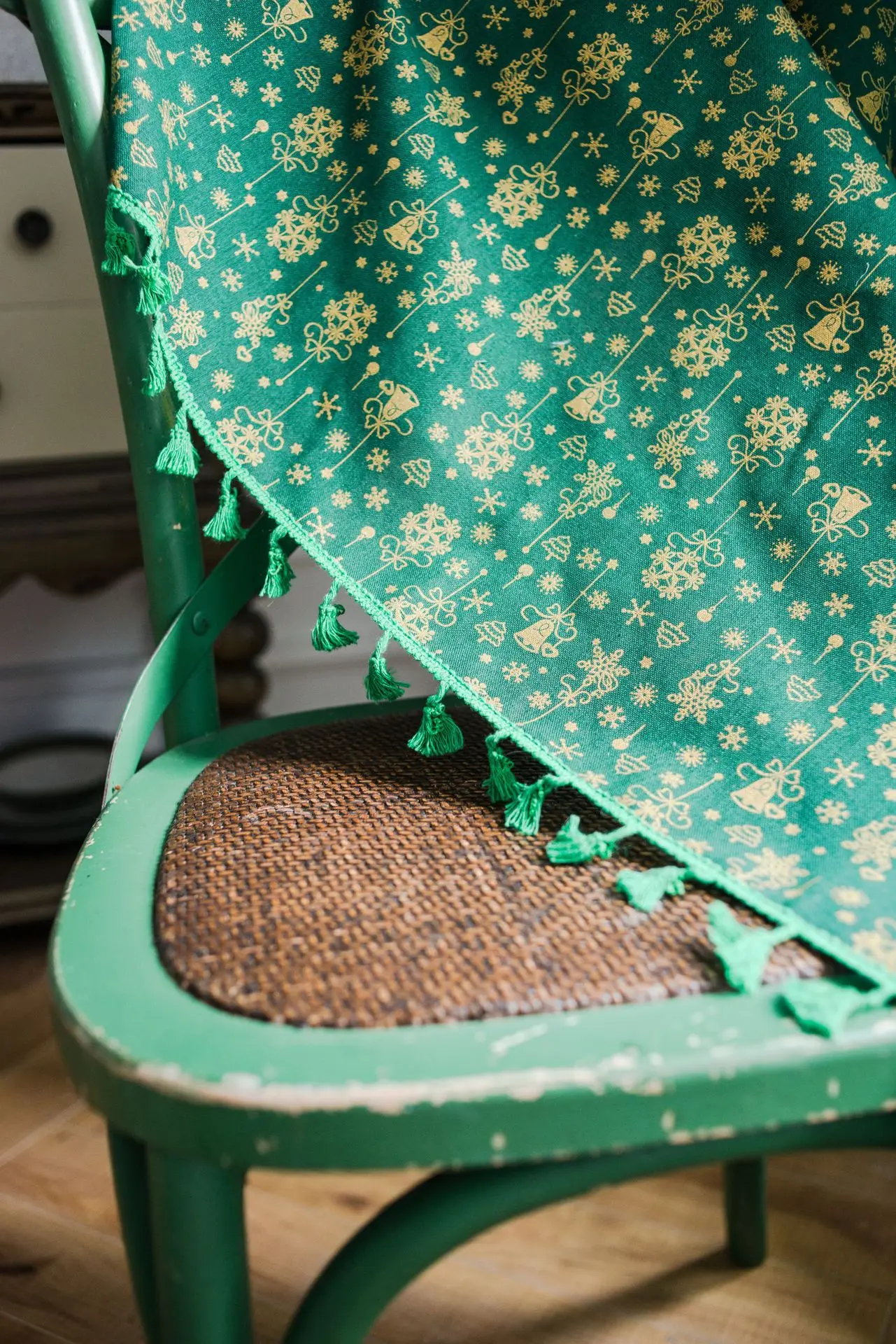 Рождественские украшения, индивидуальные шторы, зеленая хлопковая льняная ткань, занавески с кисточками, золотые колокольчики, занавески для гостиной, кухни