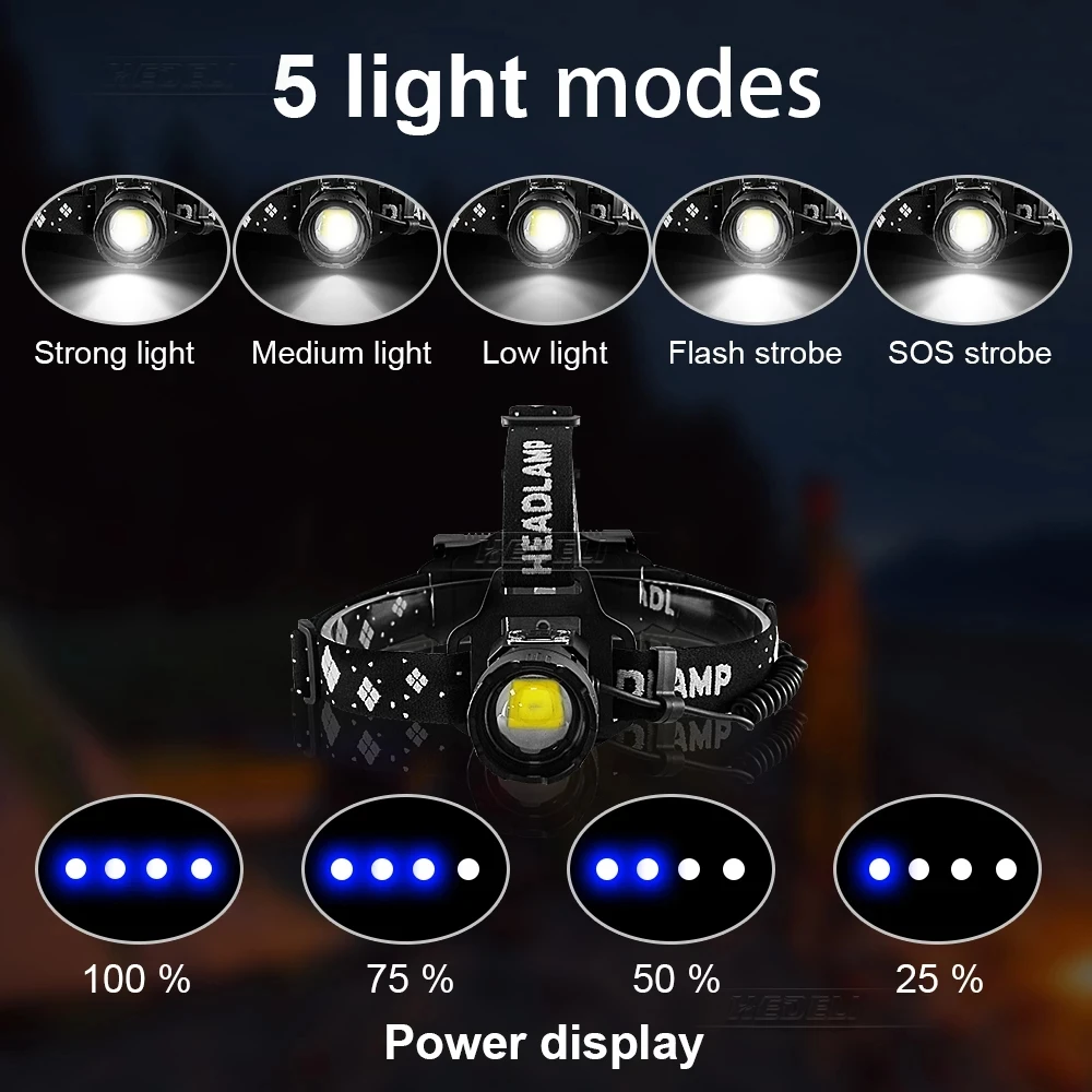Характеристика:• Бренд: YUNMAI• Название модели: 2090• Количество: 1 шт.• Светодиодный светильник: XHP199• Режим: 5 режимов (сильный светильник-средний Светильник-низкий светильник-вспышка-SOS) (датчик любого режима)• Время зарядки: 6-10 часов
