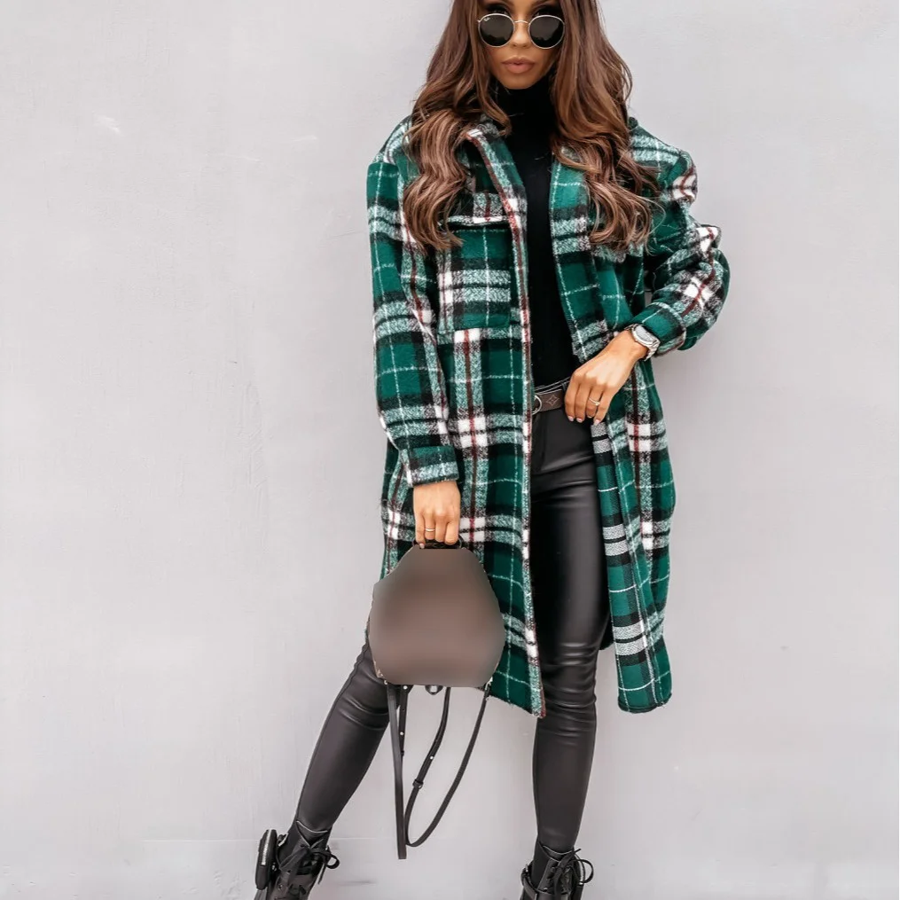 Женская длинная клетчатая куртка, повседневная Толстая куртка оверсайз с отложным воротником, модная теплая Женская длинная верхняя одежда, осень-зима