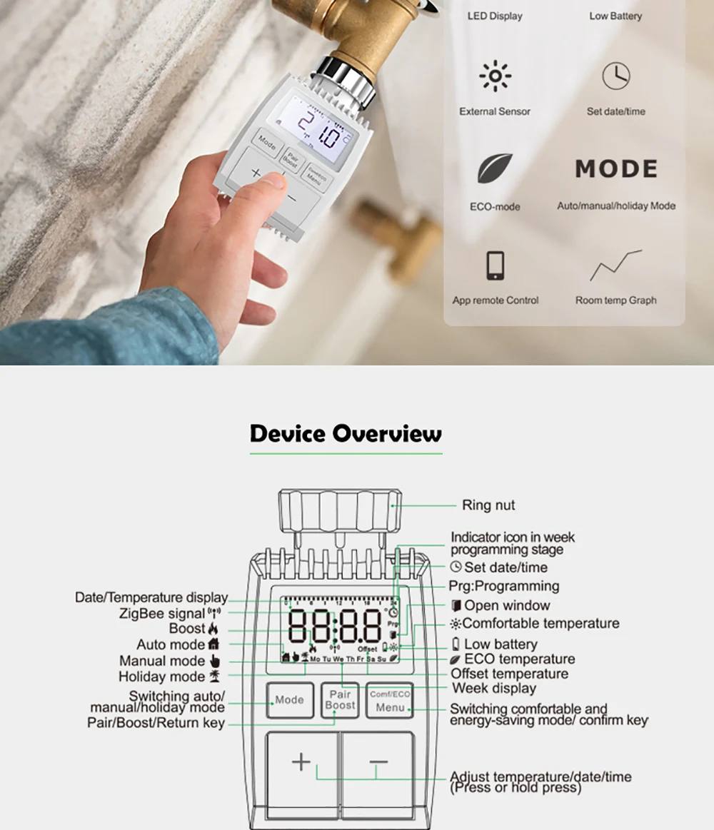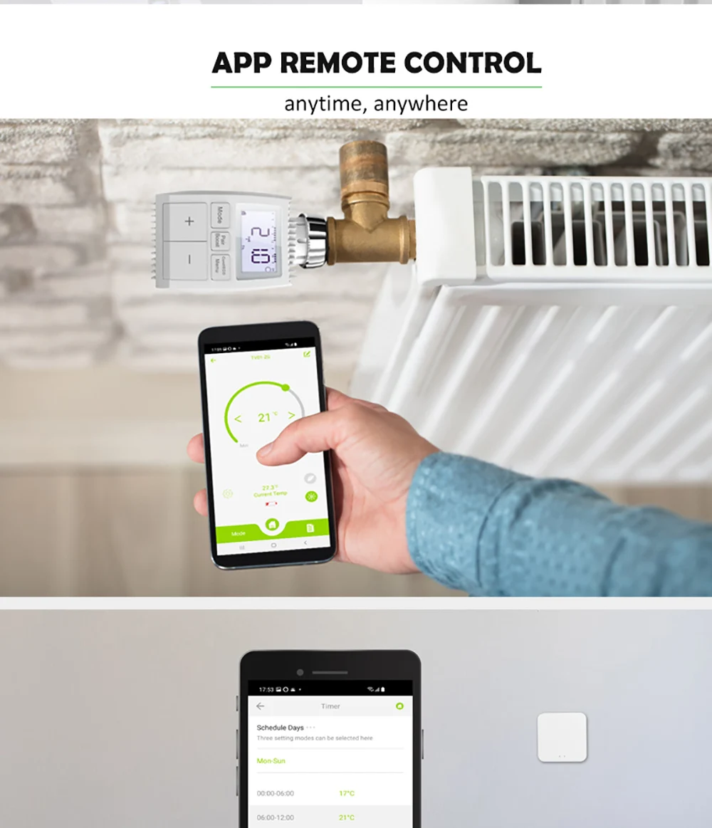 Устройство перемещает клапан, чтобы разумно контролировать поток тепла на радиатор. С клапаном радиатора термостата TV01 вы можете удобно регулировать температуру в помещении между 5-30 °C и экономить более 15% энергии.