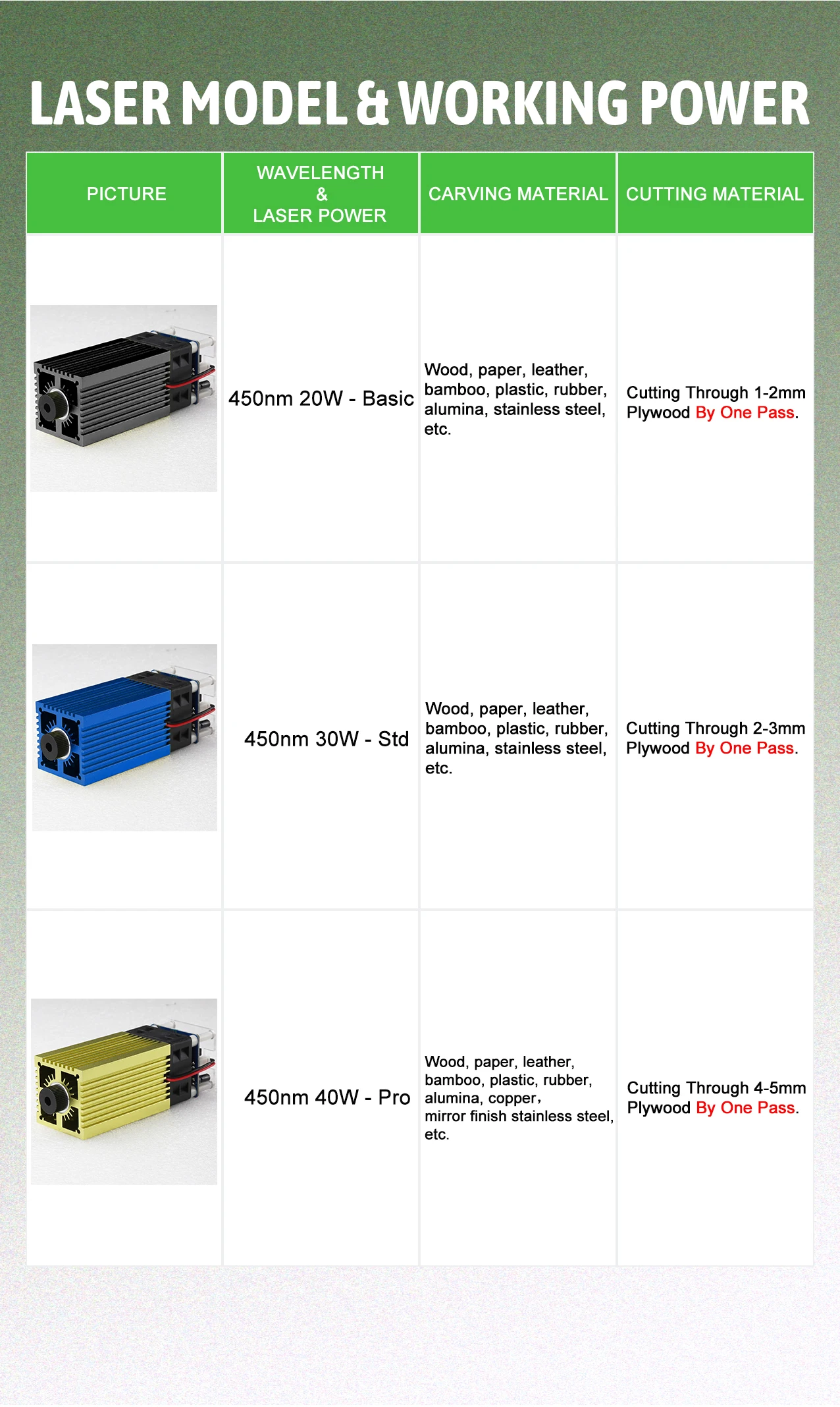 Синий лазер Modual предназначен для станка с ЧПУ. С длиной волны 450нм, это эффективный инструмент для лазерной гравировки и лазерной резки. Они могут выгравировать и резать различные материалы.Особенности:Синий лазер Modual --- профессиональная лазерная головка с высокой скоростью и высокой стабильностью. Ярко-сине-фиолетовый светильник, легко устанавливается при гравировке.Регулируемый фокус --- Регулируемая лазерная головка, легко регулируется, обеспечивает гравировку с хорошим качеством и высокой эффективностью.Легко собрать --- маленький и компактный, материал резьбы --- дерево, бумага, кожа, бамбук, пластик, резина, алюминий, нержавеющая сталь, медь и т. д.Характеристики:Мощность лазера: 40W-Pro/30W-Std/20W-Basic (опционально)Материал: алюминиевый сплав + пластикСветильник Цвет: синий с защитой от УФДлина волны: 450нмФорма Facula: пунктиформа, регулируемый фокусВходное напряжение: 12 В 2A/2.5AПараметры интерфейса: Поддержка TTL сигнала управления питаниемРазмер изделия: 12*4*4 смРазмер посылка: 14*6,2*6,2 смВес изделия: 300 гПосылка:1 * лазерная головка