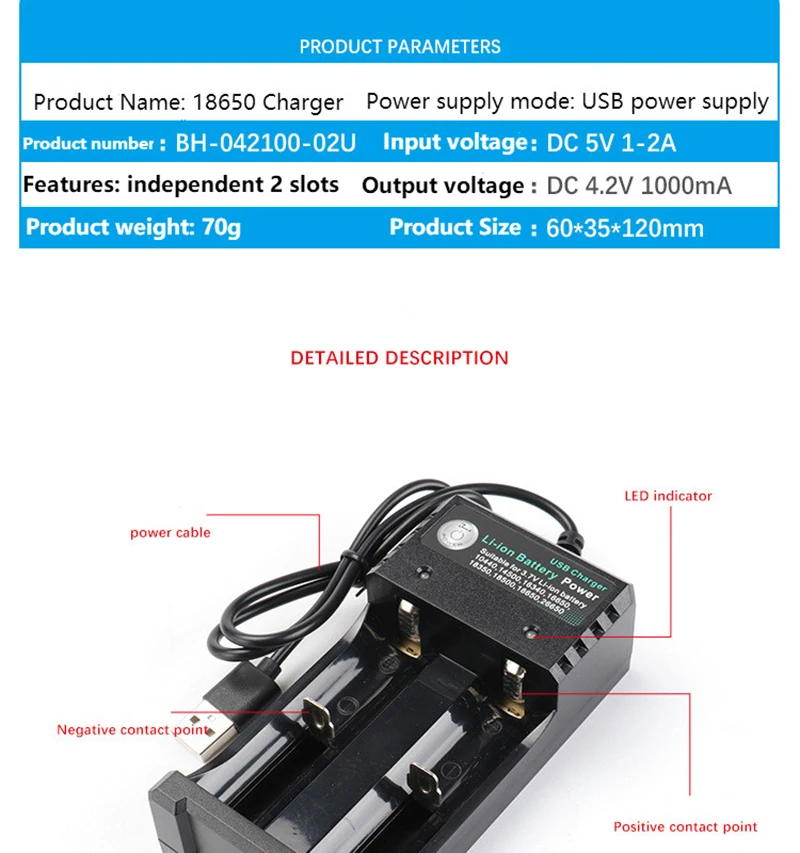 Название продукта: зарядное устройство 18650 с двумя слотами Модель продукта: BH-042100-02U Особенности: два слота для независимой зарядки Вес продукта: 70 грамм Режим питания: Обычный источник питания USB Входное напряжение: 5 В постоянного тока 1-2 А Выходное напряжение: 4,2 В постоянного тока, 1000 мАч Размер продукта: 60*35*120 мм Совместимая модель аккумулятора: 10440 14500 16340 16650 14650 18350 18500 18650Шесть видов защиты: защита от перезарядки, защита от перегрузки по току, защита от перегрева, защита от короткого замыкания, защита от обратного подключения, защита от перегрузки