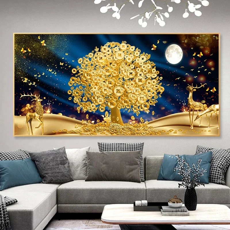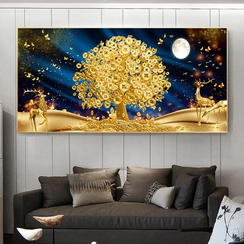 Золотая картина с изображением денег и дерева на холсте абстрактные современные плакаты и принты Настенная картина с изображением лося для гостиной домашний декор