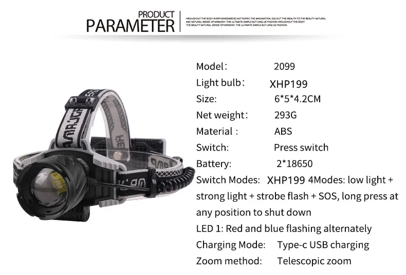 Примечание:Более 95% покупателей пожалеют, что не покупают посылка с аккумулятором и зарядным устройством, потому что в их стране батарея и зарядное устройство очень дорогие, и в Китае, аккумулятор и зарядное устройство не только превосходны по качеству, но и очень дешево. Поэтому рекомендуется приобрести посылка с аккумулятором и зарядным устройством.• Бренд: YUNMAI• Название модели: 2099• Количество: 1 шт.• Светодиодный излучатель: XHP199• Режим: 4 режима (высокий-низкий-Стробоскоп)(Нажмите и удерживайте кнопку переключения, чтобы включить функцию датчика)• Срок службы: 100000 часов• Цвет: черный• Излучаемый Цвет: белый светильник• Линзы: выпуклая линза• Материал корпуса: прочный авиационный алюминий• Батарея: 2*18650 аккумуляторЗарядное устройство:• Вход: AC110-220V 47-63 Гц• Выход: 3,7 V; 1AБатарея• Качество: 2 шт.• Материал: литий-ионный аккумулятор• Напряжение: 3,7 V