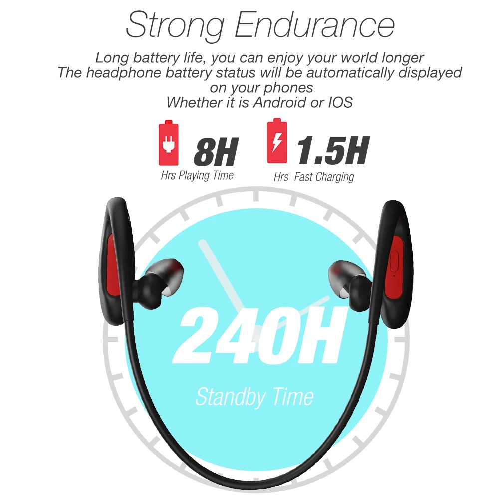 Версия Bluetooth: V4.1Управление Bluetooth: класс 2Уровень водонепроницаемости: IPX7Режим: гарнитура/handsfree / A2DP / AVRCPРабочий диапазон: около 30 футов (10 метров)Зарядка Напряжение: 4,8 до 5,5 V DCВремя воспроизведения MP3: около 4-6 часовВремя работы в режиме ожидания: около 180 часовВремя зарядки: около 2 часовСертификат: CE, ROHS, FCC и BQB могут быть примененыСостояние батареи: IOS поддерживает, зависит от мобильный телефонЦвет: черный, красныйВ комплект входят аксессуары:A. Зарядный кабель Micro USB * 1B. Наушники * 2 парыC. Руководство пользователя * 1D. Розничная коробка * 1