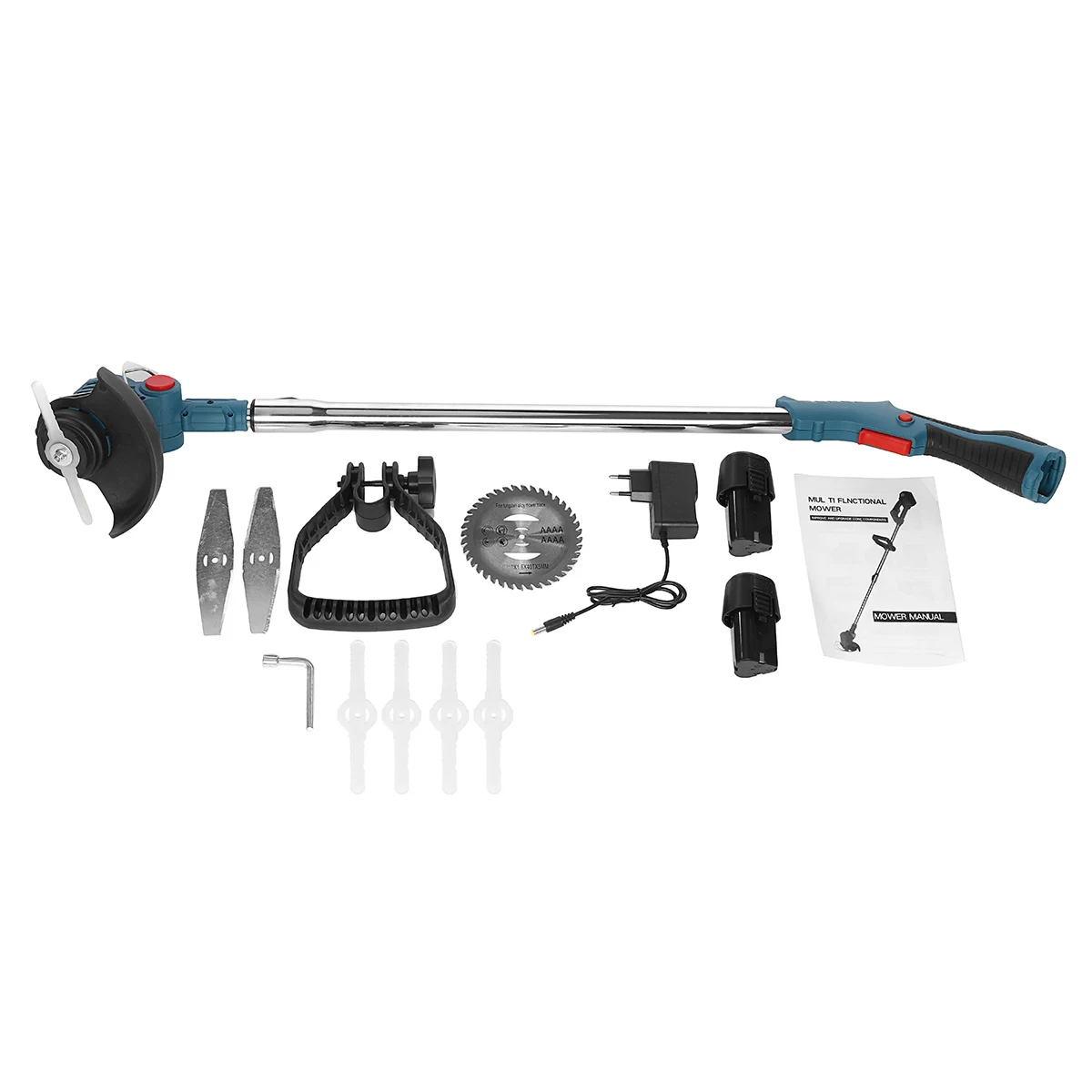 Посылка включает в себя:1 x беспроводной электрический триммер для травы1/2 x батареяЗарядное устройство-1 шт.1 x легированная пила1 x пластиковое лезвие для скашивания1 x металлическое лезвие для скашивания