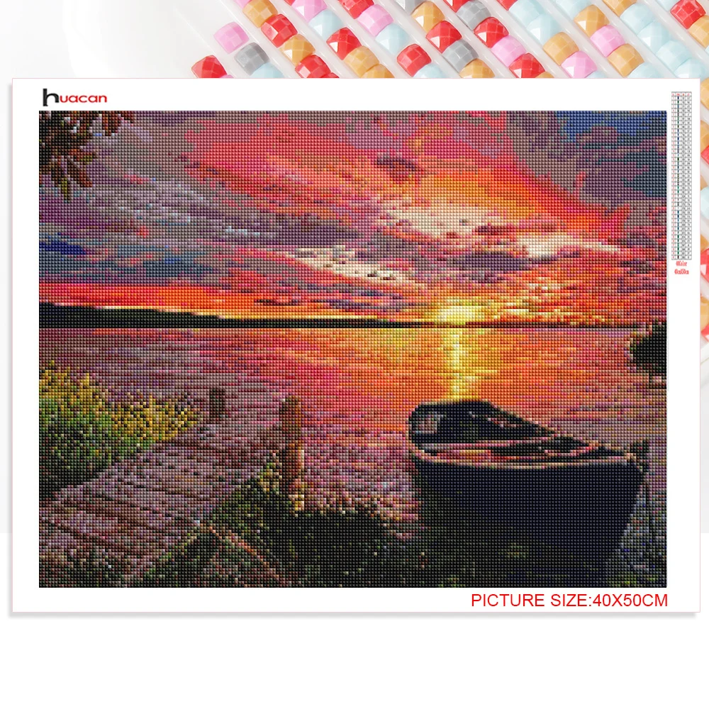 Алмазная живопись Huacan 5D сделай сам, закат, полная Алмазная вышивка, мозаика, пейзаж, лодка, стразы, украшение для дома