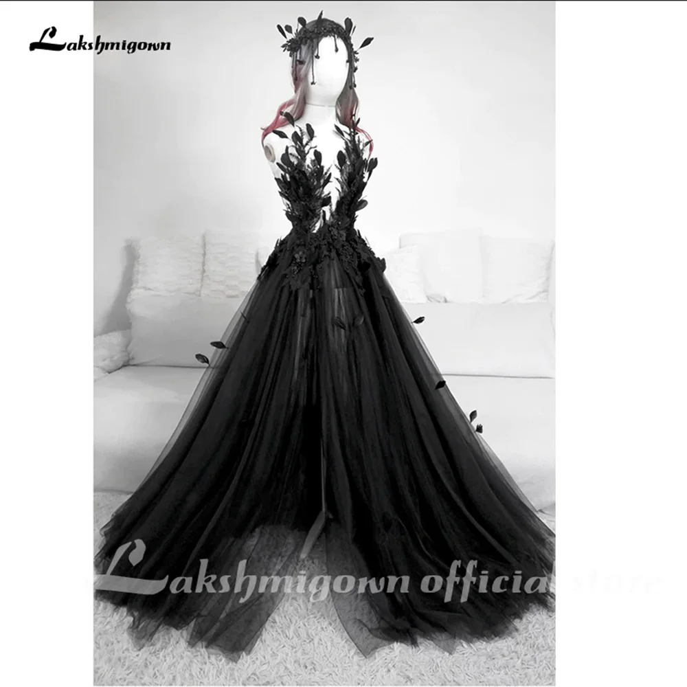 Готические черные свадебные платья с перьями, винтажные с открытой спиной, с разрезом сбоку, со шлейфом-кисточкой, трапециевидные искусственные аппликации