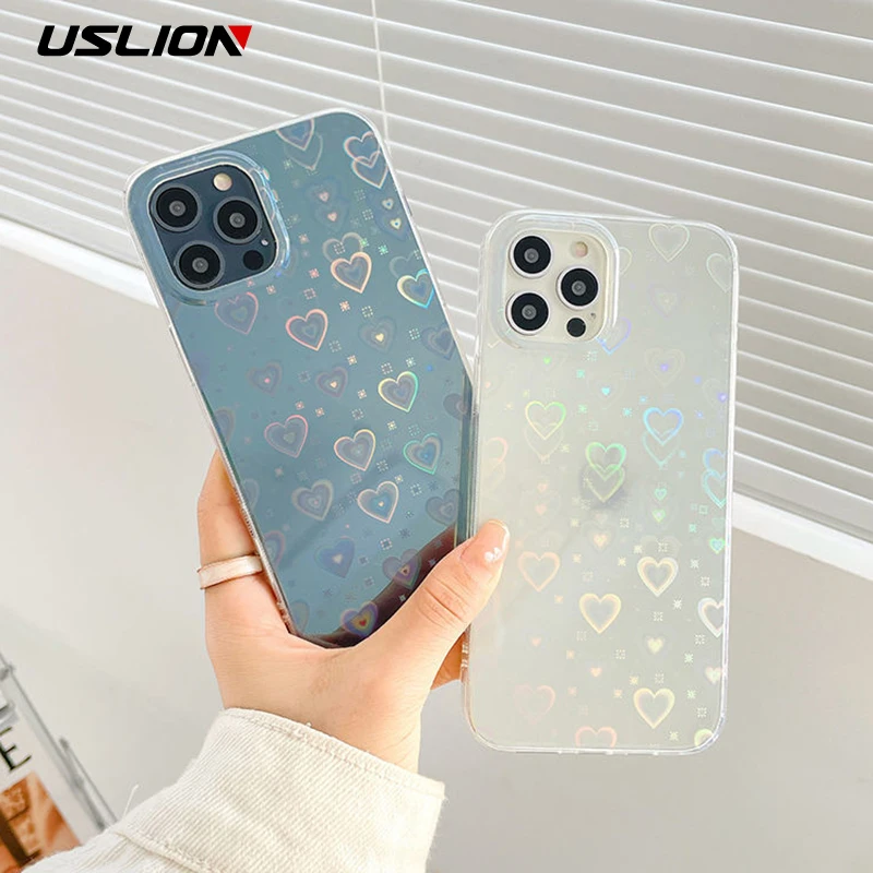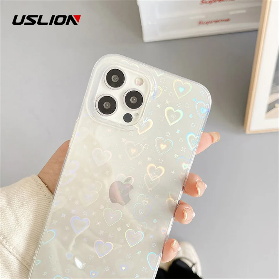 Модный градиентный лазерный чехол USLION с любовным сердцем, прозрачный чехол для телефона iPhone 11 12 Pro Max X XS XR 7 8 Plus, противоударный бампер