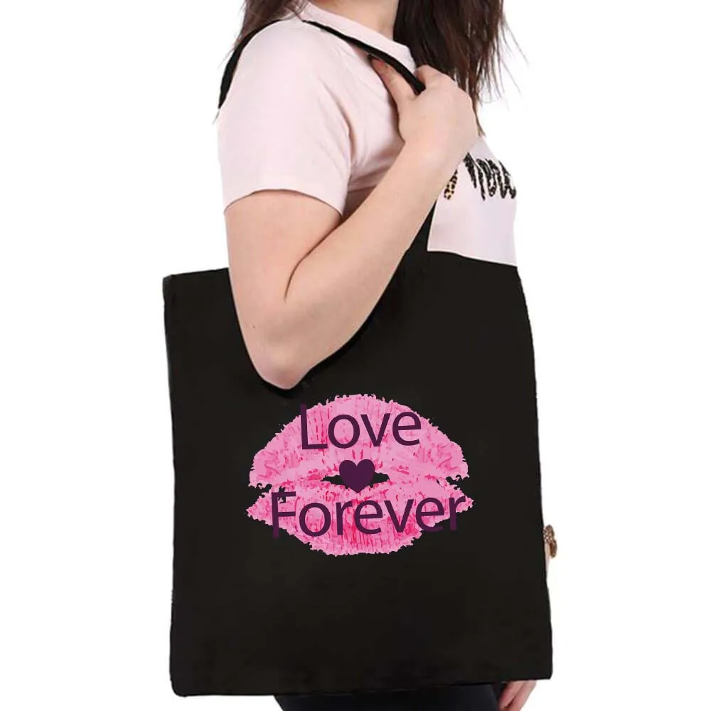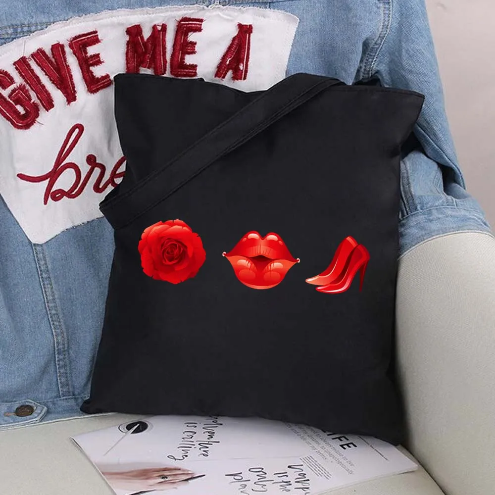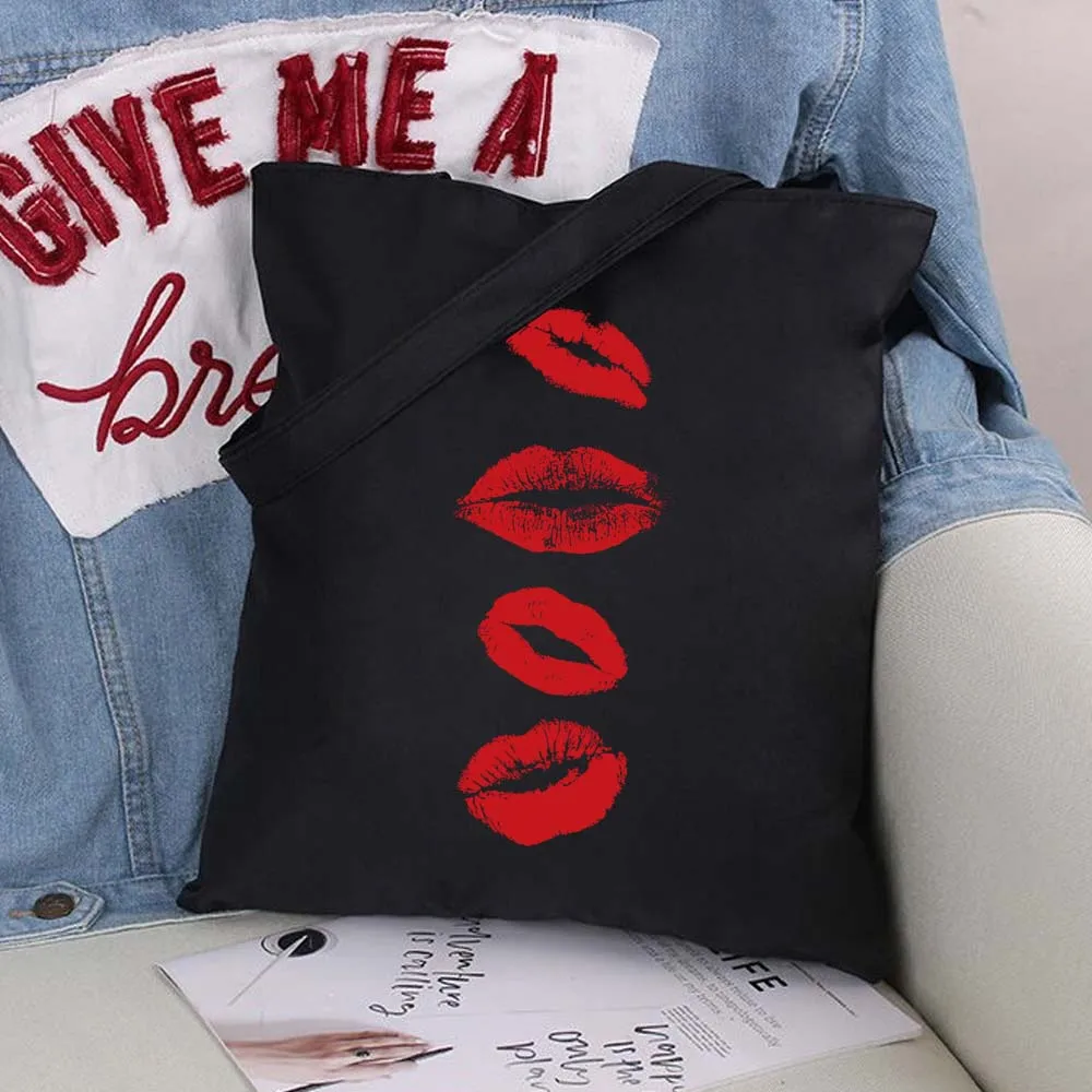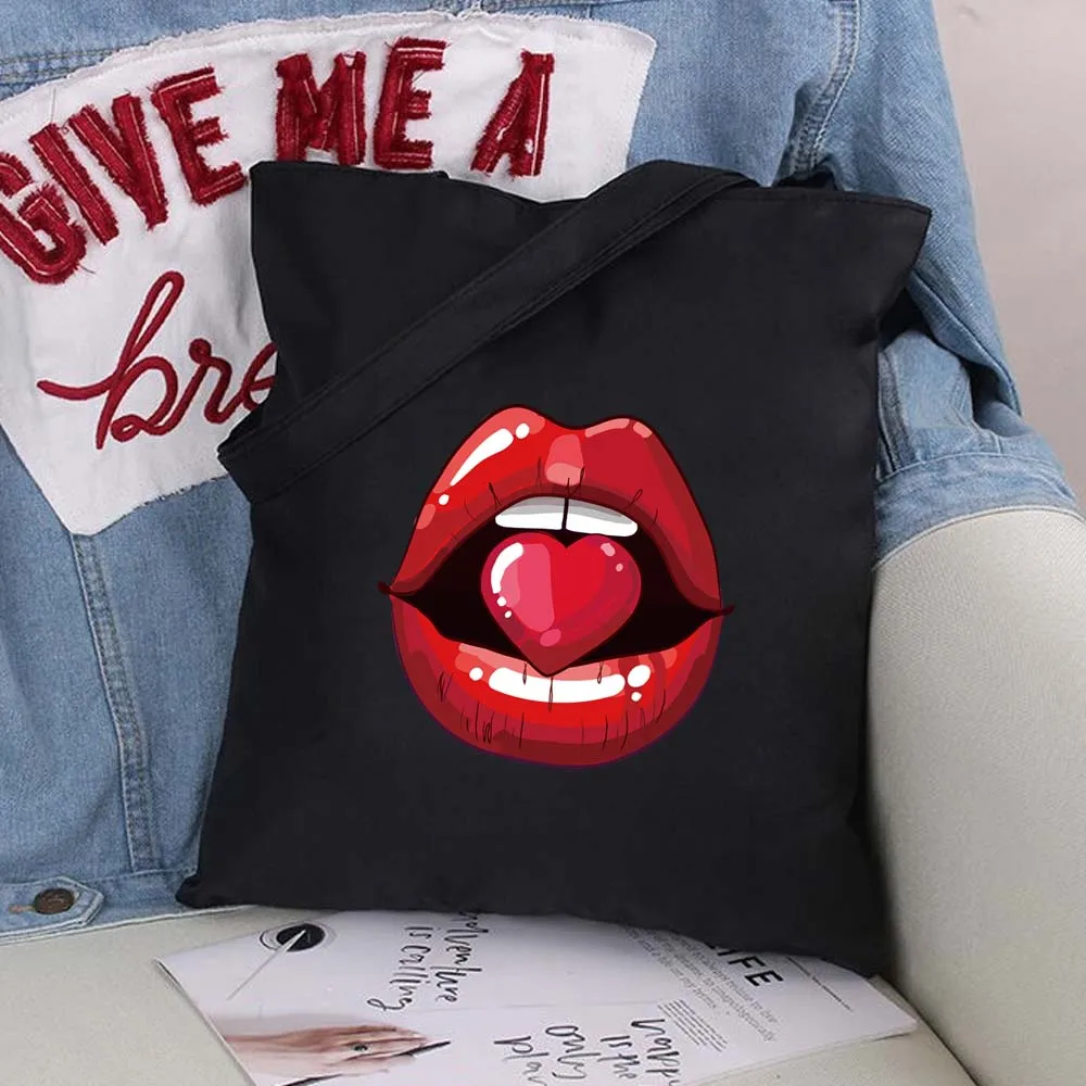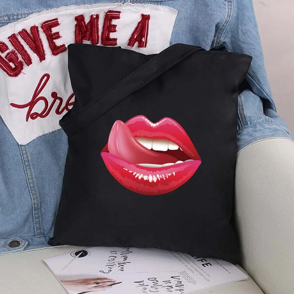 Вместительные женские сумки для покупок с сексуальными губами, сумка на плечо, модная черная складная сумка с принтом, Холщовая Сумка-тоут