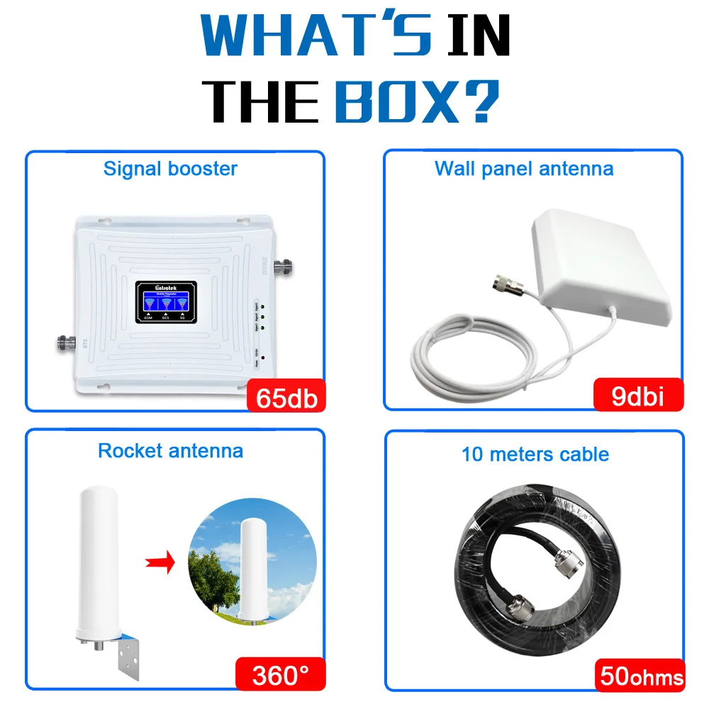 1. Трехполосный усилитель для GSM900mhz + WCDMA2100mhz + DCS1800mhz2. Источник питания3. Omni антенна4. Внутренняя настенная антенна5,10 метров черный RG6 коаксиальный кабель